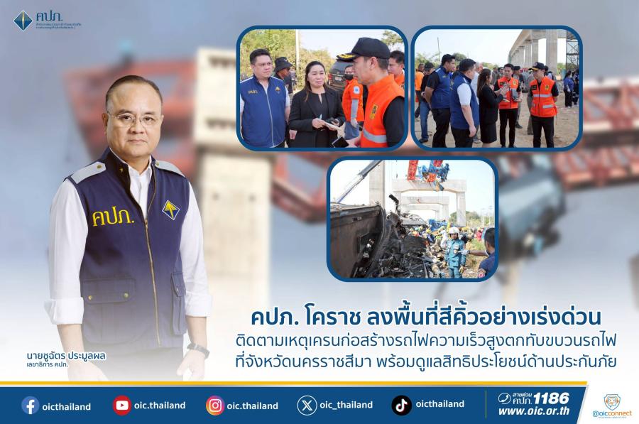 คปภ. โคราช ลงพื้นที่สีคิ้วอย่างเร่งด่วน ติดตามเหตุเครนก่อสร้างรถไฟความเร็วสูงตกทับขบวนรถไฟ