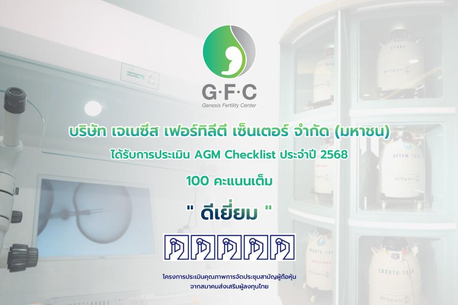 บริษัท เจเนซีส เฟอร์ทิลีตี เซ็นเตอร์ จำกัด (มหาชน) “GFC” ผู้ให้บริการทางการแพทย์สำหรับผู้มีปัญหามีบุตรยากแบบครบวงจร ได้รับคะแนนประเมินคุณภาพการจัดประชุมสามัญผู้ถือหุ้น 100 คะแนนเต็ม (5 เหรียญ) หรือระดับ “ดีเยี่ยม” ต่อเนื่องเป็นปีที่ 2 จากโครงการประเมินคุณภาพการจัดประชุมสามัญผู้ถือหุ้น ประจำปี 2568 (AGM Checklist) จัดขึ้นโดยสมาคมส่งเสริมผู้ลงทุนไทย และสภาธุรกิจตลาดทุนไทย