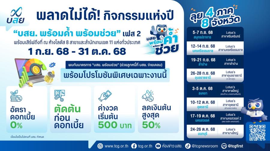กิจกรรม “บสย. พร้อมค้ำ พร้อมช่วย” เฟส 2 เป็นการสานต่อความร่วมมือของ บสย. กับ บริษัท ซีพี แอ็กซ์ตร้า จำกัด (มหาชน) โดย บสย. ได้ระดมทีมงานผู้เชี่ยวชาญพร้อมให้คำแนะนำในการปรับโครงสร้างหนี้แก่ลูกหนี้ บสย. ณ ห้างโลตัส 8 สาขา รวม 4 ภูมิภาค จัดขึ้นในช่วงสุดสัปดาห์ วันศุกร์-อาทิตย์ ตลอด 2 เดือน เริ่มที่ โลตัส สาขาศรีนครินทร์ วันที่ 5-7 ก.ย. ต่อเนื่องที่ โลตัส สาขานครศรีธรรมราช 12-14 ก.ย. โลตัส สาขาลำปาง 19-21 ก.ย. โลตัส สาขาอุบลราชธานี 26-28 ก.ย. โลตัส สาขาหาดใหญ่ (ตรงข้าม ม.สงขลานครินทร์) 3-5 ต.ค. โลตัส สาขาอุดรธานี (ต.หมากแข้ง) 10-12 ต.ค. โลตัส สาขานครสวรรค์ 2 (เดอะวอล์ค นครสวรรค์) 17-19 ต.ค. และโลตัส สาขาบางใหญ่ 24-26 ต.ค. 2568