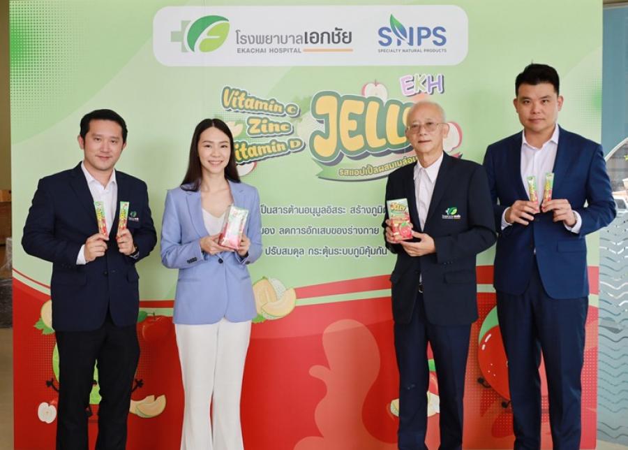นายแพทย์ อำนาจ เอื้ออารีมิตร (ที่ 2 จากขวา) กรรมการและผู้อำนวยการโรงพยาบาล พร้อมทีมผู้บริหาร บริษัท เอกชัยการแพทย์ จำกัด (มหาชน) (EKH) และ ดร.ธีรญา กฤษฎาพงษ์ (ที่ 2 จากซ้าย) ประธานเจ้าหน้าที่บริหาร บริษัท สเปเชี่ยลตี้ เนเชอรัล โปรดักส์ จำกัด (มหาชน) (SNPS) ร่วมวิจัยและพัฒนาผลิตภัณฑ์เสริมอาหารรูป EKH Jelly รสแอปเปิ้ลผสมเมล่อน ซึ่งเป็นผลิตภัณฑ์รวมสารอาหารเสริมภูมิคุ้มกันเพื่อทุกคนในครอบครัว หลากหลายประโยชน์ใน 1 ซอง โดย SNPS เป็นผู้ดำเนินการผลิต ส่วน EKH เป็นผู้ดำเนินการจัดจำหน่ายผ่านช่องทางการจัดจำหน่ายทั้งแบบออฟไลน์และออนไลน์
