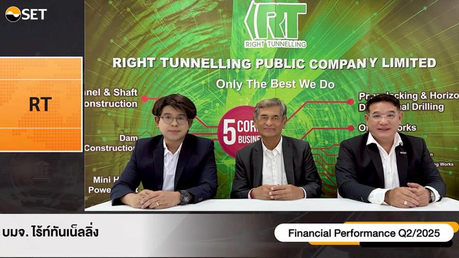นายชวลิต ถนอมถิ่น (กลาง) ประธานเจ้าหน้าที่บริหาร นายไชยา วงศ์ลาภพานิช (ขวา) กรรมการผู้จัดการ และ นายปรเมษฐ์ มัชฌิมา (ซ้าย) ผู้ช่วยกรรมการผู้จัดการสายงานบัญชีและการเงิน บมจ. ไร้ท์ทันเน็ลลิ่ง (RT) ให้ข้อมูลสรุปผลประกอบการไตรมาส 2/68 รายได้รวม 863 ล้านบาท กำไรสุทธิ 13 ล้านบาท ทิศทางธุรกิจครึ่งปีหลัง 2568 ตุน Backlog มูลค่า 4253 ล้านบาท พร้อมคุมต้นทุนรัดกุม มุ่งบริหารกระแสเงินสด เสริมสภาพคล่องรองรับโครงการในอนาคต ในงานบริษัทจดทะเบียนพบผู้ลงทุน (Opportunity Day) จัดโดยตลาดหลักทรัพย์แห่งประเทศไทย