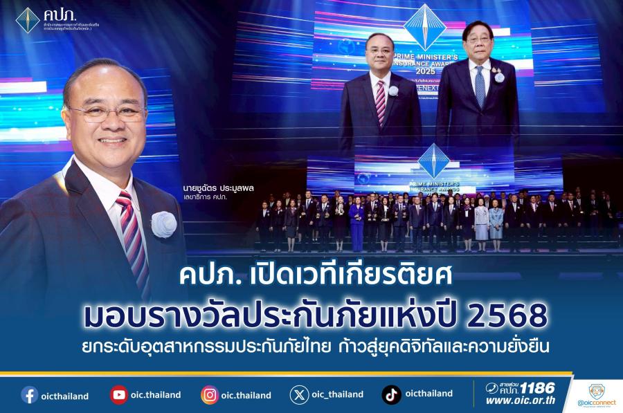 สำนักงานคณะกรรมการกำกับและส่งเสริมการประกอบธุรกิจประกันภัย (สำนักงาน คปภ.) จัดงานพิธีมอบรางวัลประกันภัยดีเด่นครบวงจร (Prime Minister’s Insurance Awards 2025) ภายใต้แนวคิด “INSURENEXT Driving the Future of Insurance with Digital Innovation & Sustainability - ขับเคลื่อนอนาคตประกันภัย ด้วยนวัตกรรมดิจิทัลและความยั่งยืน” ซึ่งพิธีมอบรางวัลจัดขึ้นอย่างยิ่งใหญ่ ณ ห้องบางกอกคอนเวนชัน เซ็นเตอร์ เอวัน โรงแรม เซ็นทาราแกรนด์ และบางกอกคอนเวนชันเซ็นเตอร์ เซ็นทรัลเวิลด์ โดยได้รับเกียรติจาก นายพิชัย ชุณหวชิร รองนายกรัฐมนตรีและรัฐมนตรีว่าการกระทรวงการคลัง เป็นประธานในการมอบรางวัล
