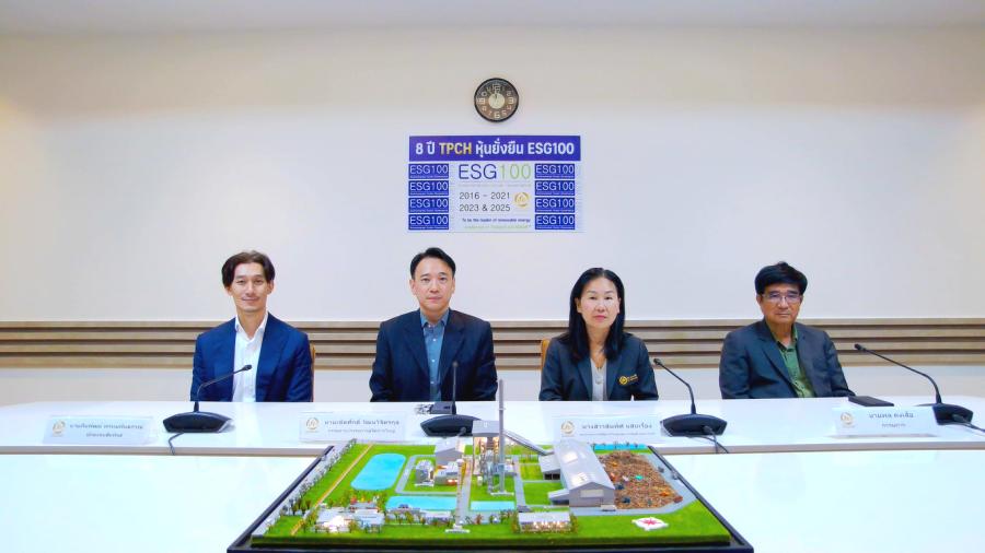 นายเชิดศักดิ์ วัฒนวิจิตรกุล (ที่ 2 จากซ้าย) กรรมการผู้จัดการใหญ่ นายพล คงเสือ (ที่ 1 จากขวา) รองกรรมการผู้จัดการฝ่ายก่อสร้างและดำเนินงาน และนางสาวสมพิศ แสนเรือง (ที่ 2 จากขวา) รองกรรมการผู้จัดการฝ่ายบัญชีและการเงิน พร้อมทีมผู้บริหาร บริษัท ทีพีซี เพาเวอร์ โฮลดิ้ง จำกัด (มหาชน) (TPCH) ร่วมนำเสนอข้อมูลในงานบริษัทจดทะเบียนพบผู้ลงทุน “Opportunity Day” ประจำไตรมาส 2/2568 และแผนการดำเนินธุรกิจครึ่งปีหลัง ผ่านระบบ Video Conference โดยระบุว่า บริษัทฯ เร่งก่อสร้างโครงการโรงไฟฟ้าพลังงานแสงอาทิตย์ในสาธารณรัฐประชาธิปไตยประชาชนลาว (สปป.ลาว) กำลังการผลิต 100 เมกะวัตต์ คาดว่า จะสามารถ COD ได้ภายในไตรมาส 4/2568 ส่วนการพัฒนาโรงไฟฟ้าพลังงานขยะ ทั้งโรงไฟฟ้าขยะชุมชน สยาม พาวเวอร์ หนองสาหร่าย (SPNS) กำลังการผลิตติดตั้ง 9.9 เมกะวัตต์ และโรงไฟฟ้าขยะชุมชน สยาม พาวเวอร์ นากลาง (SPNK) ขนาดกำลังการผลิตติดตั้ง 9.9 เมกะวัตต์ คาดว่า จะเริ่มก่อสร้างในไตรมาส 3/2568 ควบคู่กับการพัฒนาโครงการโรงไฟฟ้าพลังงานขยะรูปแบบ VSPP อีก 4 โครงการ มั่นใจ ผลงานเติบโตตามเป้าหมาย โดยงานดังกล่าวจัดขึ้นที่บริษัทฯ เมื่อเร็วๆ นี้