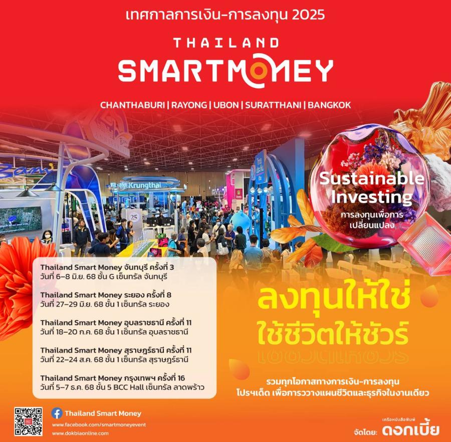ทั้งนี้ การเดินสาย 4 จังหวัดถือเป็นการนำร่องสู่การจัดงานใหญ่ส่งท้ายปี “Thailand Smart Money 2025 กรุงเทพฯ” ภายใต้แนวคิด “Sustainable Investing: การลงทุนเพื่อการเปลี่ยนแปลง” ซึ่งจะจัดขึ้นระหว่าง วันที่ 5-7 ธันวาคม BCC Hall ชั้น 5 เซ็นทรัลลาดพร้าว โดยงานดังกล่าวจะเป็นศูนย์รวมสถาบันการเงินชั้นนำและบริการด้านการลงทุนไว้อย่างครบวงจร พร้อมกิจกรรมเสวนาพิเศษและสิทธิประโยชน์ทางการเงินที่จะตอบสนองความต้องการของผู้เข้าร่วมงานได้อย่างรอบด้าน