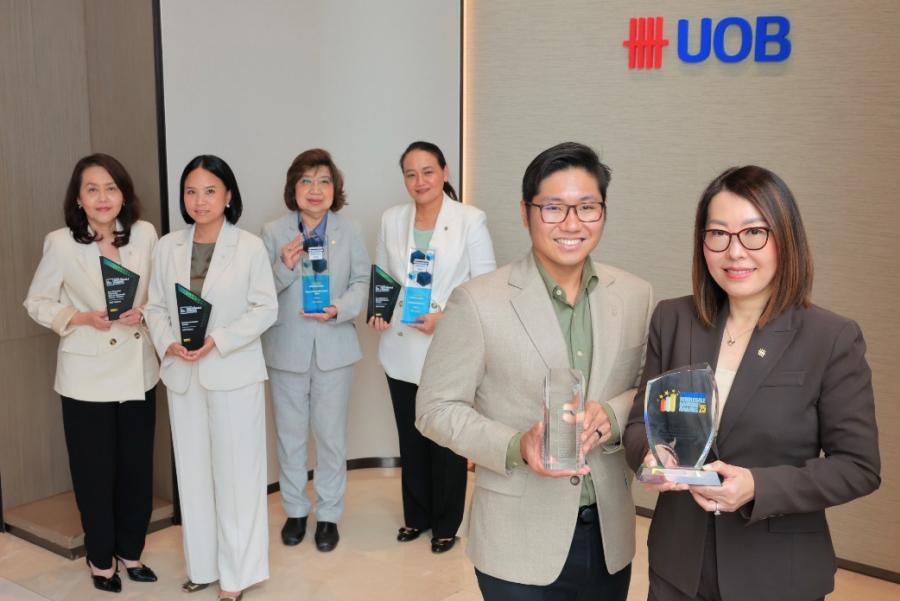 ธนาคารยูโอบี ประเทศไทย นำโดยนางวีระอนงค์ จิระนคร ภู่ตระกูล กรรมการผู้จัดการ Deputy CEO และ Wholesale Banking (ที่ 1 จากขวา) นาย เชา วง ยวน ประธานเจ้าหน้าที่ฝ่ายความยั่งยืน (ที่ 2 จากขวา) นางสาวพนิตศนี ตั๊นสวัสดิ์ ผู้ช่วยกรรมการผู้จัดการใหญ่ Corporate Banking (ที่ 3 จากขวา) นางพัชนี ว่องศิลป์วัฒนา ผู้ช่วยกรรมการผู้จัดการใหญ่ Transaction Banking (ที่ 3 จากซ้าย) นางพณิตตรา เวชชาชีวะ ผู้ช่วยกรรมการผู้จัดการใหญ่ Financial Institution และ ESG Solutions (ที่ 2 จากซ้าย) และ นางอัมพร ทรัพย์จินดาวงศ์ ผู้ช่วยกรรมการผู้จัดการใหญ่ Commercial Banking (ที่ 1 จากซ้าย) ภูมิใจได้รับ 7 รางวัล จากเวทีระดับนานาชาติจากการเป็นผู้นำด้านความยั่งยืนสะท้อนถึงบทบาทความเป็นผู้นำในการสนับสนุนภาคธุรกิจให้เปลี่ยนผ่านสู่เศรษฐกิจคาร์บอนต่ำ
