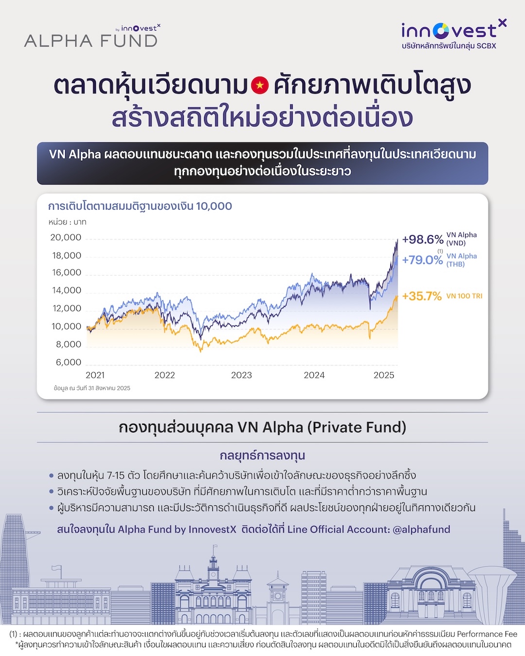 บล. อินโนเวสท์ เอกซ์ เรือธงด้านการลงทุนภายใต้กลุ่ม เอสซีบี เอกซ์ (SCBX Group) ตอกย้ำความเป็นผู้นำในตลาดกองทุนส่วนบุคคล (Private Fund) เพื่อตอบโจทย์ลูกค้าที่มีความมั่งคั่งสูง (Ultra High Net Worth) โดยหน่วยงาน Private Fund Management ภายใต้ชื่อ Alpha Fund มุ่งสร้างกลยุทธ์การลงทุนระดับโลกที่แตกต่างจากกองทุนรวมทั่วไป ด้วยการบริหารพอร์ตที่คัดเลือกหุ้นเชิงลึกเพื่อสร้างมูลค่าในระยะยาว ปัจจุบัน Alpha Fund บริหารการลงทุนครอบคลุม 4 นโยบายหลัก ได้แก่ TH Alpha (ลงทุนในประเทศไทย) VN Alpha (ลงทุนในเวียดนาม) ID Alpha (ลงทุนในอินโดนีเซีย) และ Global Alpha (ลงทุนในตลาดพัฒนาแล้ว เช่น สหรัฐอเมริกา และยุโรป) ล่าสุด VN Alpha Fund ซึ่งเป็นกองเรือธง (Flagship Fund) สามารถสร้างผลตอบแทนสะสม 79%(1) ตั้งแต่จัดตั้งกองทุนในปี 2021 ในขณะที่ VN Index ในช่วงเวลาเดียวกันเพิ่มขึ้น 36% (ข้อมูล ณ 31 สิงหาคม 2025) และมีทรัพย์สินภายใต้การจัดการ (AUM) เติบโตจากระดับ 1 พันล้านบาทในปี 2019 เป็นกว่า 1 หมื่นล้านบาทในปัจจุบัน สะท้อนศักยภาพในการสร้างมูลค่าการลงทุนระยะยาว และความเชี่ยวชาญของทีมผู้จัดการกองทุน Private Fund ของ InnovestX โดยเฉพาะในตลาดเวียดนาม
