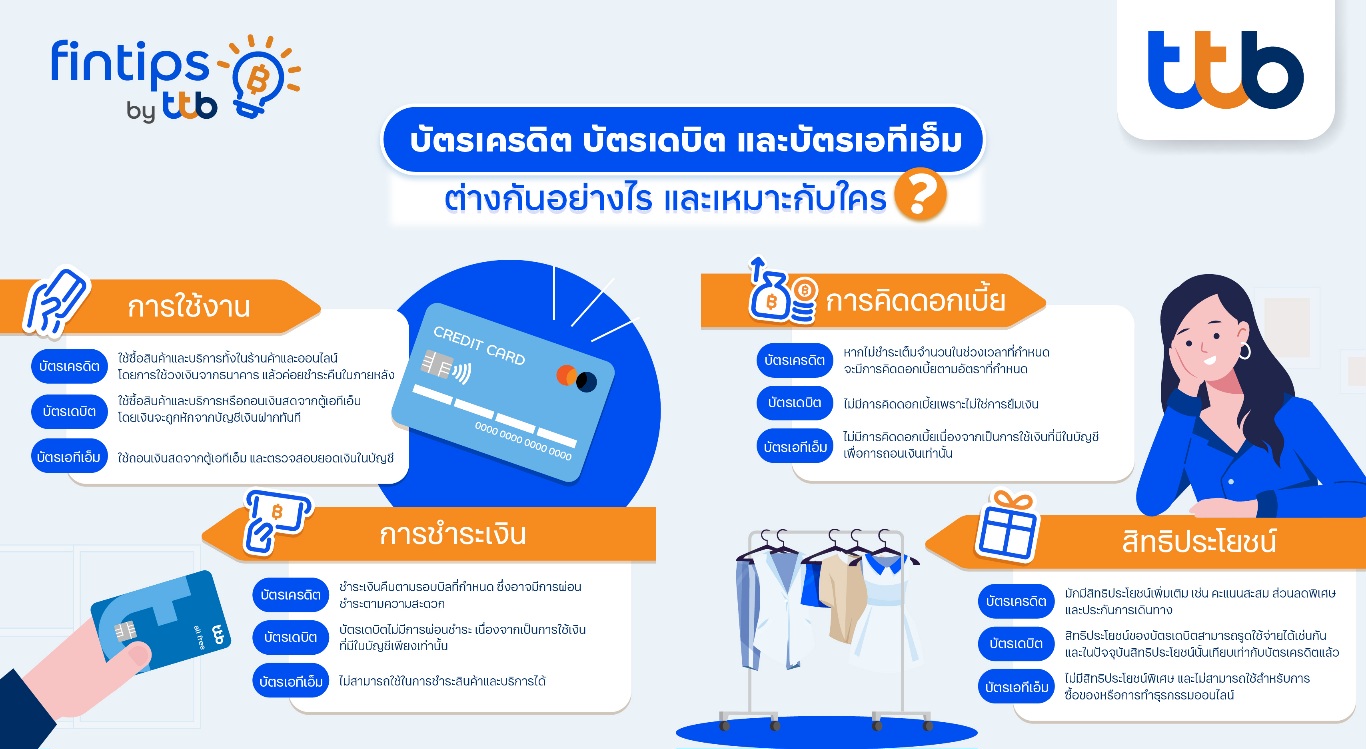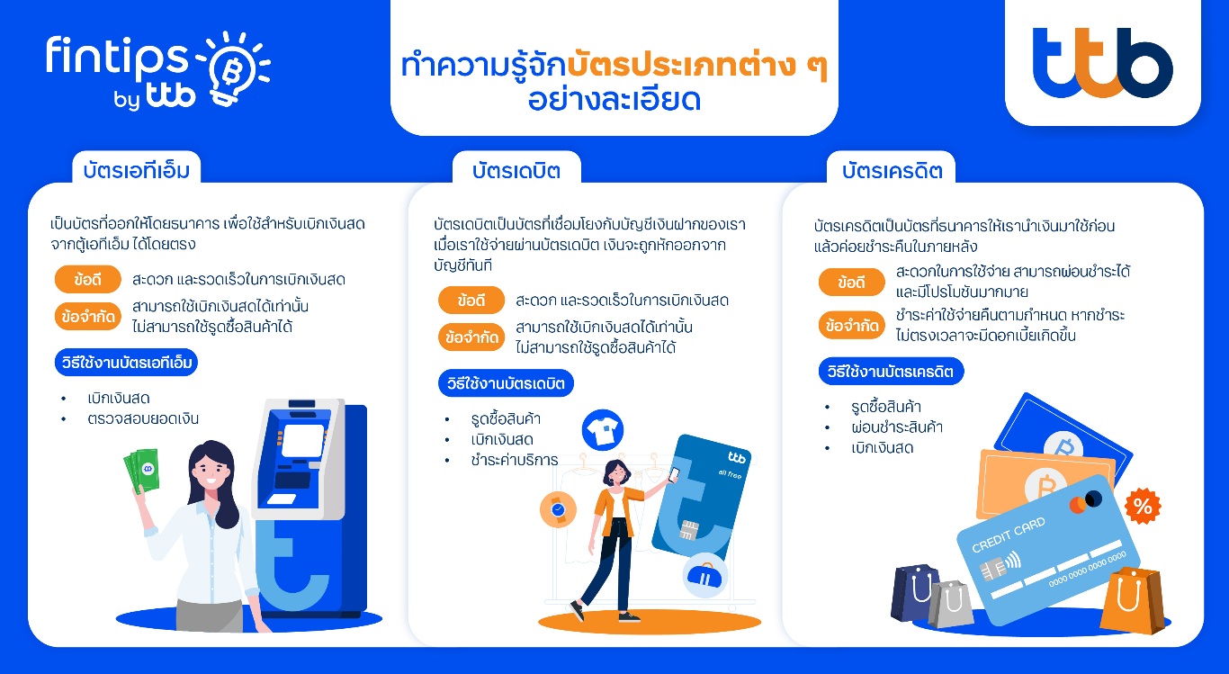 ในยุคสังคมไร้เงินสด ผู้คนต่างพากันใช้บัตรเดบิต บัตรเอทีเอ็ม และบัตรเครดิต เพื่อความสะดวกสบายในการทำธุรกรรม ทั้งการเบิกเงินสดหรือการโอนเงินเพื่อซื้อสิ่งของที่จำเป็น เพื่อใช้แทนการพกเงินสดจำนวนมาก แต่การมีบัตรหลายประเภทก็ทำให้หลายคนเกิดความสับสนว่า บัตรเดบิตกับบัตรเอทีเอ็มต่างกันอย่างไร หรือบัตรเดบิตกับบัตรเครดิต ต่างกันอย่างไร? วันนี้ fintips by ttb #เรื่องเงินที่รู้จริงแบบเพื่อนที่รู้ใจ จึงชวนมาทำความรู้จักให้ชัด ว่าแต่ละบัตรมีการใช้งานอย่างไรให้ถูกประเภทและคุ้มค่า