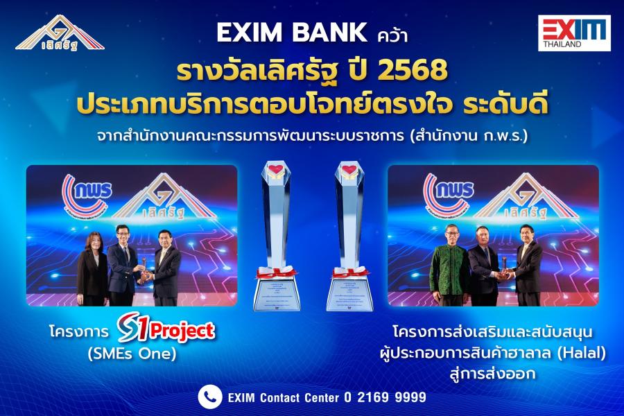 นายไมตรี อินทุสุต ประธานคณะทำงานเสริมสร้างประสิทธิภาพการบริหารงานจังหวัดแบบบูรณาการ และผู้ทรงคุณวุฒิในคณะทำงานตรวจประเมินรางวัลเลิศรัฐ สำนักงานคณะกรรมการพัฒนาระบบราชการ (สำนักงาน ก.พ.ร.) มอบรางวัลเลิศรัฐ ปี 2568 สาขาบริการภาครัฐ ประเภทบริการตอบโจทย์ตรงใจ ระดับดี จำนวน 2 รางวัล ได้แก่ โครงการส่งเสริมและสนับสนุนผู้ประกอบการสินค้าฮาลาล (Halal) สู่การส่งออก โดยมีนายชลัช รัตนบุญนิธิ ผู้ช่วยกรรมการผู้จัดการ ธนาคารเพื่อการส่งออกและนำเข้าแห่งประเทศไทย (EXIM BANK) และ ดร.ทวีลาภ ฤทธาภิรมย์ กรรมการและผู้จัดการธนาคารอิสลามแห่งประเทศไทย (ไอแบงก์) เป็นผู้แทนเข้ารับรางวัล และโครงการ The S1 Project (SMEs One) ดร.เบญจรงค์ สุวรรณคีรี รองกรรมการผู้จัดการ EXIM BANK เป็นผู้แทนเข้ารับรางวัล สำหรับ “โครงการส่งเสริมและสนับสนุนผู้ประกอบการสินค้าฮาลาล (Halal) สู่การส่งออก” EXIM BANK ไอแบงก์ และหน่วยงานพันธมิตรรวม 15 หน่วยงาน ร่วมลงนามในบันทึกข้อตกลงความร่วมมือ (MOU) และจัดกิจกรรมเพื่อส่งเสริมศักยภาพและสนับสนุนผู้ประกอบการ SMEs ไทยให้สามารถส่งออกสินค้าฮาลาลไปยังตลาดต่างประเทศได้ โดยส่งเสริมและพัฒนาองค์ความรู้ทางวิชาการด้านฮาลาล การเข้าถึงเครื่องหมายรับรองมาตรฐานฮาลาล ตลอดจนการเข้าถึงแหล่งเงินทุนและเครื่องมือทางการเงิน เพื่อเสริมศักยภาพของธุรกิจและการบริหารความเสี่ยงทางการค้าระหว่างประเทศ ผลสำเร็จของโครงการ มีจำนวนผู้ประกอบการสินค้าฮาลาลที่ได้รับความรู้ด้านการส่งออกและมาตรฐานฮาลาลสะสม 891 ราย สามารถส่งออกได้ 200 ราย และได้รับการรับรองมาตรฐานฮาลาล 430 ราย ประมาณการก่อให้เกิดเม็ดเงินต่อระบบเศรษฐกิจจากมูลค่าการส่งออก 5176 ล้านบาท และ “โครงการ The S1 Project (SMEs One)” ซึ่งเป็นโครงการความร่วมมือกับบรรษัทประกันสินเชื่ออุตสาหกรรมขนาดย่อม (บสย.) ที่ต้องการนำเทคโนโลยีเข้ามายกระดับมาตรฐานการให้บริการด้านสินเชื่อและการค้ำประกันสินเชื่อสำหรับ SMEs ให้มีความสะดวกรวดเร็ว กระชับ ฉับไว และเป็นหนึ่งเดียว ตอบสนองความต้องการของ SMEs ได้ดียิ่งขึ้น โดยผู้ประกอบการ SMEs สามารถขอใช้ทั้ง 2 บริการได้เพียงการสมัครมาภายในครั้งเดียวผ่านช่องทางออนไลน์ซึ่งสะดวกสบายสมัครได้ 24 ชั่วโมง ใน 7 วัน นอกเหนือจากนั้น โครงการ The S1 Project (SMEs One) ยังสามารถนำไปปรับใช้กับหน่วยงานพันธมิตรอื่น ๆ เพื่อให้สามารถช่วยเหลือผู้ประกอบการ SMEs ได้อย่างมีประสิทธิภาพ ผลงานดังกล่าวสะท้อนความมุ่งมั่นของ EXIM BANK ที่มุ่งยกระดับประสิทธิภาพการให้บริการภาครัฐให้มีมาตรฐานเทียบเท่าสากลเพื่อมุ่งสู่องค์กรที่เป็นเลิศ ซึ่งการมอบรางวัลนี้จัด