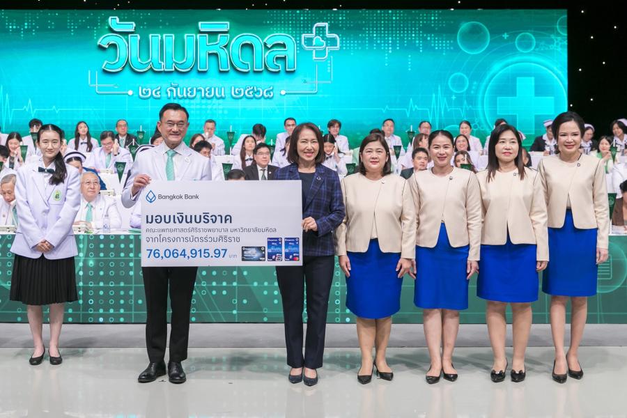 นางสาวพจณี คงคาลัย ผู้ช่วยผู้จัดการใหญ่ บริหารความสัมพันธ์และการขาย (ที่ 5 จากขวา) นางรัตตพร ฉายาสิริวงศ์ เจ้าหน้าที่บริหารระดับ Vice President สนับสนุนระบบงานพิธีการอิเล็กทรอนิกส์ (ที่ 2 จากขวา) นางศิริกุล ไชยสิงห์ ผู้จัดการภาคนครหลวง 3 (ที่ 4 จากขวา) นางสาวนริสา เหล่าพานิช ผู้จัดการสาขาสะพานพระปิ่นเกล้า (ขวาสุด) ธนาคารกรุงเทพ จำกัด (มหาชน) ในฐานะผู้แทนธนาคารส่งมอบเงินบริจาค จำนวน 76064915.97 บาท ที่มาจาก “โครงการบัตรร่วมศิริราช ธนาคารกรุงเทพ” ที่ผู้ถือบัตรเป็น “ผู้ให้” สร้างคุณประโยชน์ทางการแพทย์ในทุกยอดการใช้จ่าย ระหว่างวันที่ 1 กันยายน 2567 – 31 สิงหาคม 2568 แก่ ศาสตราจารย์ นายแพทย์อภิชาติ อัศวมงคลกุล คณบดี คณะแพทยศาสตร์ศิริราชพยาบาล มหาวิทยาลัยมหิดล (ซ้ายสุด) ในงาน “วันมหิดล” เพื่อสมทบทุนช่วยผู้ป่วยด้อยโอกาส จัดซื้ออุปกรณ์ทางการแพทย์และพัฒนาศูนย์ความเป็นเลิศทางการแพทย์ศิริราช และรำลึกถึงพระมหากรุณาธิกรุณาธิคุณของสมเด็จพระมหิตลาธิเบศร อดุลยเดชวิกรม พระบรมราชชนก “พระบิดาแห่งการแพทย์แผนปัจจุบันของไทย” สำหรับ “โครงการบัตรร่วมศิริราช ธนาคารกรุงเทพ” เพียงลูกค้าใช้จ่ายผ่านบัตร ‘บัตรบีเฟิสต์ สมาร์ท ทีพีเอ็น ศิริราช’ หรือ ‘บัตรเครดิตวีซ่า แพลทินัม ศิริราช ธนาคารกรุงเทพ’ ธนาคารกรุงเทพจะสมทบให้ศิริราช 0.2% ของยอดการใช้จ่ายในแต่ละรอบบัญชี และทุกการสมัครบัตรใหม่ ‘บัตรบีเฟิสต์ สมาร์ท ทีพีเอ็น ศิริราช’ ธนาคารร่วมบริจาค 100 บาท และค่าธรรมเนียมรายปี ทุกปีต่อไป ธนาคารจะร่วมบริจาค 50 บาท