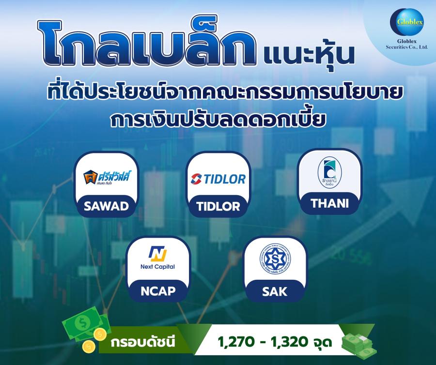 นายวัชเรนทร์ จงยรรยง ผู้อำนวยการฝ่ายวิจัย บล.โกลเบล็ก แนะนำกลยุทธ์การลงทุนในหุ้นที่ได้ประโยชน์จากคณะกรรมการนโยบายการเงิน (กนง.) ปรับลดดอกเบี้ย ได้แก่ SAWAD TIDLOR THANI NCAP และ SAK