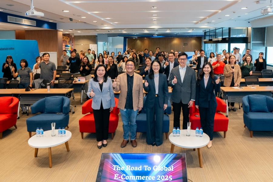 นางสาวศนิสา พลังตระกูล ผู้ช่วยกรรมการผู้จัดการ ธนาคารเพื่อการส่งออกและนำเข้าแห่งประเทศไทย (EXIM BANK) นายกฤษดา สิงหา นักวิชาการพาณิชย์ชำนาญการ สำนักตลาดพาณิชย์ดิจิทัล ดร.เจษฎาพัญ ทองศรีนุช นักวิชาการพาณิชย์ชำนาญการ สำนักยุทธศาสตร์การค้าระหว่างประเทศ กรมส่งเสริมการค้าระหว่างประเทศ กระทรวงพาณิชย์ นายกันตภณ พร้อมมูล ผู้จัดการฝ่ายพันธมิตรภาครัฐและปฏิบัติการ บริษัท ช้อปปี้ (ประเทศไทย) จำกัด และนายสิริเชษฐ์ จิรพงษ์วัฒนะ กรรมการผู้จัดการ บริษัท สยาม คอนซูมเมอร์ โปรดักส์ จำกัด ร่วมเปิดโครงการ “The Road to Global E-Commerce 2025” เพื่อส่งเสริมศักยภาพผู้ประกอบการ SMEs ไทยให้ก้าวสู่โอกาสทางการค้าระหว่างประเทศผ่านช่องทาง E-Commerce ในภูมิภาคอาเซียนบนแพลตฟอร์ม TOPTHAI และ Shopee International รวมถึงการสนับสนุนสิทธิประโยชน์โครงการ SMEs Pro-Active และถ่ายทอดประสบการณ์จริงและกลยุทธ์การทำธุรกิจจากผู้ประกอบการที่ประสบความสำเร็จเพื่อให้ผู้ประกอบการ SMEs ไทยสามารถเข้าถึงตลาดการค้าออนไลน์ได้อย่างมั่นใจ ผ่านองค์ความรู้ที่จำเป็นต่อความสำเร็จทางธุรกิจ พร้อมเปิด EXIM Export Clinic ให้คำปรึกษาด้านการเงิน และการป้องกันความเสี่ยงทางการค้าระหว่างประเทศ ณ EXIM BANK สำนักงานใหญ่ เมื่อวันที่ 23 กันยายน 2568