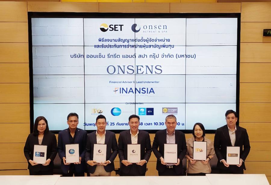 “ONSENS” เคาะราคาขายหุ้นไอพีโอ 2.05 บาท เปิดจองซื้อระหว่างวันที่ 29 - 30 ก.ย. และ 1 ต.ค. นี้ คาดว่าหุ้นจะเข้าเทรดในหลักทรัพย์ในประเทศไทย (SET) 7 ต.ค. นี้ มั่นใจนักลงทุนให้การตอบรับคึกคัก ตอกย้ำการเป็นผู้นำออนเซ็นและสปาครบวงจร เล็งระดมทุนสร้าง Social Wellness Space และขยายแบรนด์พอร์ตโฟลิโอหนุนการเติบโตในระยะยาว พร้อมแต่งตั้งบล. ฟินันเซีย ไซรัส เป็นผู้จัดการการจัดจำหน่ายและรับประกันการจำหน่ายในการเสนอขายหุ้นสามัญเพิ่มทุน (IPO) จำนวน 80 ล้านหุ้น