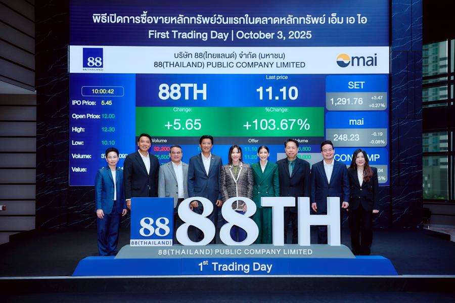 บริษัท 88(ไทยแลนด์) จำกัด (มหาชน) หรือ 88TH ผลิตภัณฑ์สุขภาพ ความงาม ภายใต้แบรนด์ ver.88 LYO และ Hone ร่วมถ่ายภาพเป็นที่ระลึกในโอกาสการเข้าซื้อขายตลาดหลักทรัพย์เอ็ม เอ ไอ (mai) วันแรก โดยได้รับเกียรติจาก นายอัสสเดช คงสิริ กรรมการและผู้จัดการ ตลาดหลักทรัพย์แห่งประเทศไทย (ที่ 4 จากซ้าย) นายสรวิศ ไกรฤกษ์ เป็นรองผู้จัดการ สายงานผู้ออกหลักทรัพย์และสายงานการตลาด(ที่ 3 จากซ้าย) พร้อมด้วยนายประพันธ์ เจริญประวัติ กรรมการผู้จัดการ ตลาดหลักทรัพย์ เอ็ม เอ ไอ (ที่ 2 จากซ้าย) พร้อมด้วยนางสาวนพรัตน์ มาลัยวงค์ (ตรงกลาง) ผู้ก่อตั้ง นางณัฐฐินี ชวนะนิกุล (ที่ 4 จากขวา) ประธานเจ้าหน้าที่บริหาร นางสาวเดือนพรรณ ลีลาวิวัฒน์ (ที่ 1 จากซ้าย) กรรมการผู้จัดการ บริษัท ไพโอเนีย แอดไวเซอรี่ จำกัด ในฐานะที่ปรึกษาทางการเงิน นายพัชระนนท์ ชีวเกรียงไกร ประธานเจ้าหน้าที่บริหาร (ที่ 2 จากขวา) และนางสาววีรยา ศรีวัฒนะ (ที่ 1 จากขวา) หัวหน้าฝ่ายวาณิชธนกิจ บริษัทหลักทรัพย์ (บล.) ซีจีเอส อินเตอร์เนชั่นแนล (ประเทศไทย) จำกัด ในฐานะผู้จัดการการจัดจำหน่ายและรับประกันการจำหน่ายหุ้น โดยราคาเปิดเทรดวันแรกอยู่ที่ 12 บาท เพิ่มขึ้น เพิ่มขึ้น 6.55 บาท หรือ 120% จากราคา IPO 5.45 บาท ขณะที่มองแนวโน้มปี 2568 เศรษฐกิจฟื้นตัวหลังได้แรงสนับสนุนจากนโยบายภาครัฐบาลกระตุ้นกำลังซื้อ พร้อมเดินหน้าสร้างนิวไฮต่อเนื่อง เมื่อวันที่ 3 ตุลาคม 2568 ณ อาคารตลาดหลักทรัพย์แห่งประเทศไทย