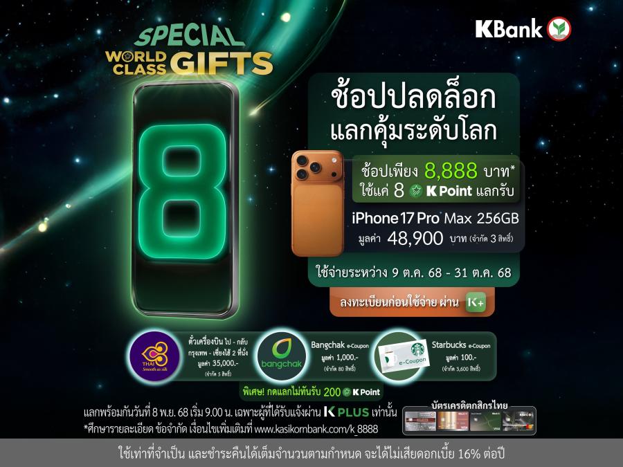 ทั้งนี้ หากพลาดในช่วงแคมเปญข้างต้น สามารถติดตามเซอร์ไพรส์ใหม่ของ Special WORLD CLASS GIFTS: ช้อปปลดล็อก แลกคุ้มระดับโลก* กับบัตรเครดิตกสิกรไทยได้อีกครั้ง โดยลงทะเบียนก่อนใช้จ่ายผ่าน K PLUS และใช้จ่ายสะสมผ่านบัตรเครดิตกสิกรไทย ครบ 8888 บาท* ในหมวดสินค้าที่ร่วมรายการ ระหว่างวันที่ 1 พฤศจิกายน 2568 – 30 พฤศจิกายน 2568 และแลกรับสินค้าได้ในวันที่ 8 ธันวาคม 2568 เวลา 9.00 น.