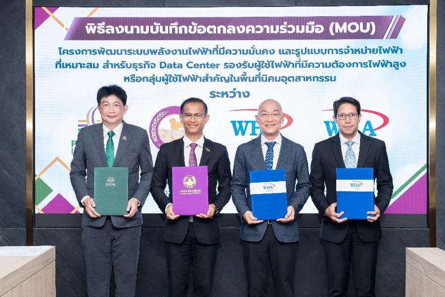 นายปจงวิช พงษ์ศิวาภัย (ที่สองจากขวา) ประธานเจ้าหน้าที่บริหาร บริษัท ดับบลิวเอชเอ อินดัสเตรียล ดีเวลลอปเมนท์ จำกัด (มหาชน) (WHAID) พร้อมด้วย นายอัครินทร์ ประเทืองสิทธิ์ (ด้านขวา) รองประธานเจ้าหน้าที่บริหารและประธานเจ้าหน้าที่ฝ่ายปฏิบัติการ บริษัท ดับบลิวเอชเอ ยูทิลิตี้ส์ แอนด์ พาวเวอร์ จำกัด (มหาชน) ( WHAUP ) ร่วมด้วย นายประดิษฐ์ เฟื่องฟู (ที่สองจากซ้าย) รองผู้ว่าการยุทธศาสตร์ การไฟฟ้าส่วนภูมิภาค (กฟภ.) และ นายธีระ ศรีใหม่ (ด้านซ้าย) รักษาการ กรรมการผู้จัดการใหญ่ บริษัท พีอีเอ เอ็นคอม อินเตอร์เนชั่นแนล จำกัด ร่วมลงนามบันทึกข้อตกลงความร่วมมือ (MOU) ในโครงการพัฒนาระบบพลังงานไฟฟ้าสำหรับธุรกิจ Data Center ทั้งนี้ เพื่อรองรับดีมานด์การใช้ไฟฟ้ากลุ่มผู้ใช้ไฟฟ้าในพื้นที่นิคมอุตสาหกรรม ณ สำนักงานใหญ่ การไฟฟ้าส่วนภูมิภาค (กฟภ.)