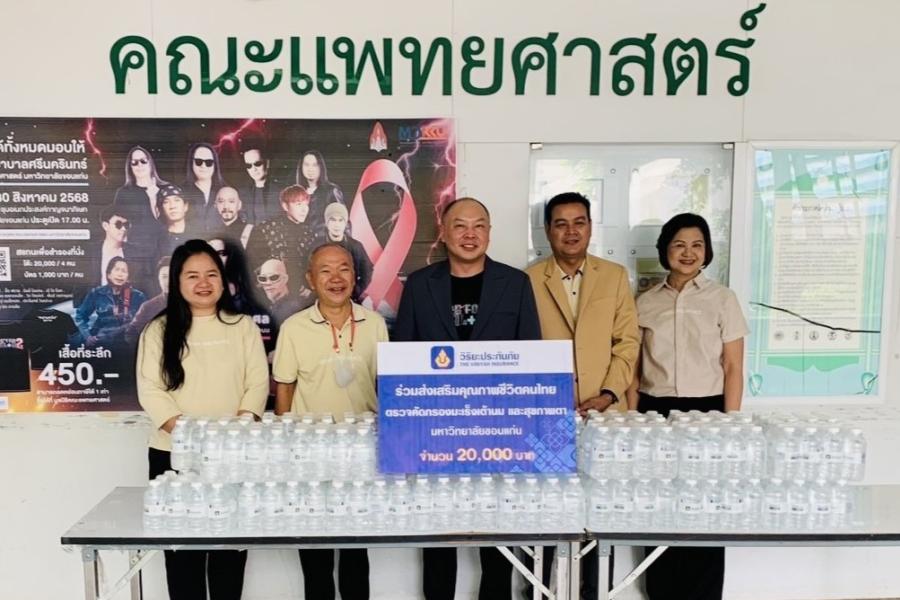 รศ.นพ.ธรรศ สงวนศักดิ์ รองคณบดีฝ่ายวิเทศสัมพันธ์และสื่อสารองค์กร คณะแพทยศาสตร์ มหาวิทยาลัยขอนแก่น รับมอบเงินสนับสนุน จำนวน 20000 บาท พร้อมน้ำดื่ม จาก บริษัท วิริยะประกันภัย จำกัด (มหาชน) โดยมี นายเอกชัย สวนเกษ ผู้จัดการศูนย์ปฏิบัติการสินไหมทดแทนขอนแก่น เป็นผู้แทนมอบ ภายใต้โครงการ “Hope for Health 2” เพื่อสนับสนุนบริการตรวจคัดกรองโรคมะเร็งเต้านม และการตรวจสุขภาพตาสำหรับประชาชน โดยเฉพาะกลุ่มเสี่ยงที่อาจขาดโอกาสในการเข้าถึงบริการทางการแพทย์ ซึ่งการสนับสนุนงบประมาณในครั้งนี้ มีส่วนสำคัญในการป้องกันและลดความรุนแรงของโรคร้าย สร้างความตระหนักรู้ด้านการดูแลสุขภาพ ตลอดจนเสริมสร้างคุณภาพชีวิตที่ดีให้กับประชาชนในพื้นที่ต่อไป ณ มหาวิทยาลัยขอนแก่น ต.ในเมือง อ.เมืองฯ จ.ขอนแก่น