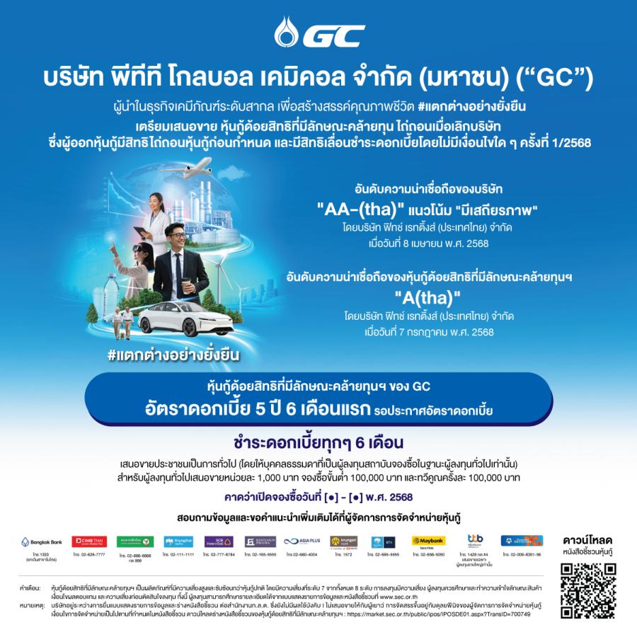 บริษัท พีทีที โกลบอล เคมิคอล จำกัด (มหาชน) หรือ GC ธุรกิจเคมีภัณฑ์ระดับสากล และแกนนำธุรกิจเคมีภัณฑ์ของกลุ่ม ปตท. ประกาศเตรียมออกและเสนอขายหุ้นกู้ด้อยสิทธิที่มีลักษณะคล้ายทุนฯ สกุลเงินบาท ชุดใหม่ ซึ่งคาดว่าจะเสนอขายต่อผู้ลงทุนทั่วไป (Public Offering) ในช่วงปลายปี 2568 โดยเป็นส่วนหนึ่งของแผนลดภาระทางการเงิน (Deleveraging Program) ที่ดำเนินการอย่างต่อเนื่องตั้งแต่ปี 2567–2568 เพื่อเสริมความแข็งแกร่งของโครงสร้างเงินทุนในระยะยาว เพิ่มความยืดหยุ่นทางการเงิน รวมถึงรองรับความท้าทายจากสภาวะเศรษฐกิจโลกและปัจจัยภูมิรัฐศาสตร์ พร้อมขับเคลื่อน GC สู่การเติบโตของธุรกิจมูลค่าสูง-คาร์บอนต่ำอย่างยั่งยืน
