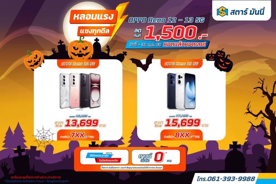 บมจ.สตาร์ มันนี่ (STARM) เสิร์ฟโปรแรงรับฮาโลวีนแบบไม่กลัวผี! ออกแคมเปญเอาใจสายช้อปมือถือ เพียงซื้อ OPPO Reno 12 หรือ Reno 13 5G รับส่วนลดทันที 1500 บาท แถมโปรสุดใจดี “ดาวน์ 0 บาท* รับเครื่องกลับบ้านได้เลย” แคมเปญนี้จัดเต็มตั้งแต่วันนี้ถึง 31 ต.ค. 2568 ทุกสาขาของ STARM พร้อมเปิดช่องทาง ทำสัญญาผ่อนออนไลน์ สำหรับลูกค้าภาคตะวันออก สะดวก รวดเร็ว ไม่ต้องเดินทาง...โปรแรงช่วงเทศกาลแบบนี้ คาดช่วยเพิ่มยอดขายมือถือ และหนุนยอดปล่อยสินเชื่อให้โตต่อเนื่องในโค้งสุดท้ายแน่นอนคร้า!!