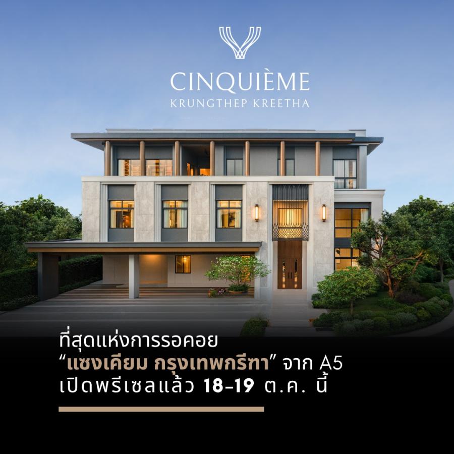 บริษัท แอสเซท ไฟว์ กรุ๊ป จำกัด (มหาชน) หรือ A5 ผู้พัฒนาอสังหาริมทรัพย์แนวราบ-แนวสูงระดับลักชัวรี เตรียมเปิดพรีเซล โครงการใหม่ “Cinquième Krungthep Kreetha” (แซงเคียม กรุงเทพกรีฑา) บ้าน Private Pool Villa หรูระดับ Ultra Luxury จำนวนจำกัดเพียง 16 ยูนิต ภายใต้แนวคิด “The Fifth Dimension of Privacy Living” ที่เน้นความเป็นส่วนตัวและคุณภาพชีวิตในทุกมิติ