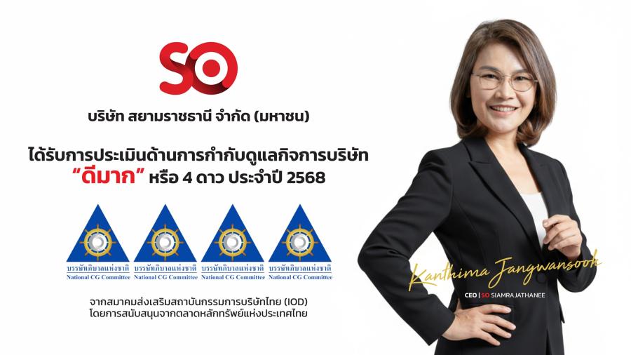 บมจ.สยามราชธานี หรือ SO ได้รับคะแนนประเมิน CGR ปี 2568 ในระดับ 4 ดาว หรือ “ดีมาก” สะท้อนความมุ่งมั่นของบริษัทในการดำเนินธุรกิจอย่าง โปร่งใส ยึดหลักธรรมาภิบาล และรับผิดชอบต่อผู้มีส่วนได้ส่วนเสีย โดยตั้งเป้าเดินหน้าสร้างการเติบโตอย่างมั่นคงและยั่งยืน เพื่อสร้างผลตอบแทนและความเชื่อมั่นแก่นักลงทุน