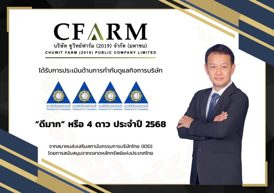 บมจ.ชูวิทย์ ฟาร์ม (2019) หรือ CFARM ปลื้มได้รับคะแนนประเมินการกำกับดูแลกิจการบริษัทจดทะเบียนไทย (CGR) ประจำปี 2568 ในระดับ 4 ดาว หรือ “ดีมาก” จากสมาคมส่งเสริมสถาบันกรรมการบริษัทไทย (IOD) สะท้อนให้เห็นถึงความตั้งใจในการดำเนินกิจการ โดยยึดหลักการกำกับดูแลกิจการที่ดีอย่างต่อเนื่อง เพื่อการพัฒนาอย่างยั่งยืนตามหลักธรรมาภิบาลที่ดีในมิติ เศรษฐกิจ สังคม และสิ่งแวดล้อม (ESG) ควบคู่การเดินหน้าขยายธุรกิจ