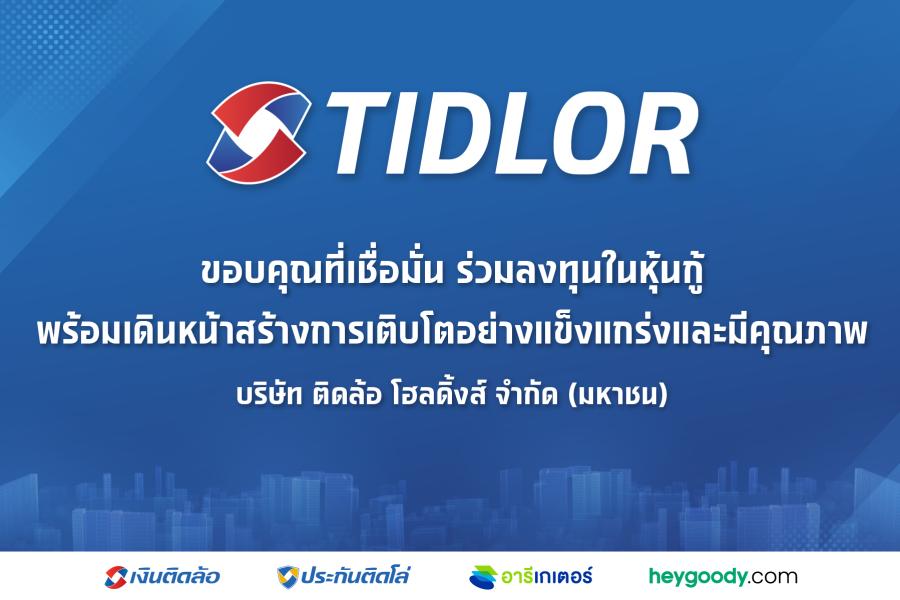 บริษัท ติดล้อ โฮลดิ้งส์ จำกัด (มหาชน) (“TIDLOR” หรือ “บริษัทฯ”) ขอบคุณผู้ลงทุนทุกท่านที่ให้ความเชื่อมั่นร่วมลงทุนสร้างผลตอบแทนกับบริษัทฯ หลังการเสนอขายหุ้นกู้รุ่นอายุ 3 ปี ซึ่งมีอัตราดอกเบี้ย 2.70% ต่อปี ได้รับความสนใจจากผู้ลงทุนเป็นจำนวนมาก มียอดจองซื้อเต็มครบตามเป้าหมายภายในระยะเวลาอันสั้น สะท้อนถึงความมั่นใจในเสถียรภาพทางการเงิน และศักยภาพการเติบโตอย่างมีคุณภาพและต่อเนื่อง