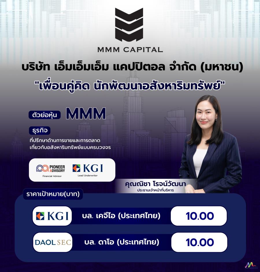 บมจ.เอ็มเอ็มเอ็ม แคปปิตอล “MMM” ประกาศตอกย้ำ Business Model ในการเป็น “โบรกเกอร์ อสังหาริมทรัพย์”แบบครบวงจร ภายใต้จุดเด่นในการวางตำแหน่งของบริษัทฯ เป็น “มินิมาร์ทอสังหาริมทรัพย์” พร้อมนำร่องรายแรกจากตลาด LiVEx สู่ตลาดหลักทรัพย์ mai เล็ง ระดมทุนขยายพอร์ตธุรกิจ 3 BU เร่งต่อยอดการเติบโตในอนาคต ด้าน บล.เคจีไอ -บล.ดาโอ สแกนหุ้น น้องใหม่ “MMM” เคาะราคาเป้าหมาย 10.00 บาท/หุ้น