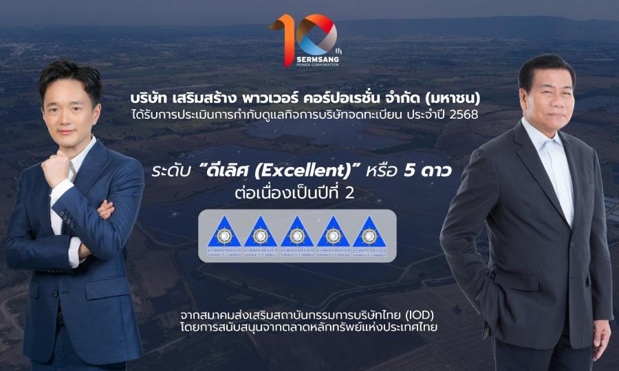 บมจ.เสริมสร้าง พาวเวอร์ คอร์ปอเรชั่น หรือ (SSP) ตอกย้ำผู้ผลิตพลังงานหมุนเวียนชั้นนำในเอเชีย ได้รับคะแนนการประเมินการกำกับดูแลกิจการในระดับ 5 ดาว หรือ “ดีเลิศ” (Excellent CG Scoring) 2 ปีซ้อน จากโครงการสำรวจด้านการกำกับดูแลกิจการของบริษัทจดทะเบียนไทย ประจำปี 2568 (Corporate Governance Report of Thai Listed Companies 2025 : CGR) จากสมาคมส่งเสริมสถาบันกรรมการบริษัทไทย (IOD) โดยการสนับสนุนจากตลาดหลักทรัพย์แห่งประเทศไทย และสำนักงานคณะกรรมการกำกับหลักทรัพย์และตลาดหลักทรัพย์ (ก.ล.ต.) สะท้อนถึงศักยภาพในการดำเนินธุรกิจของกลุ่มบริษัท ที่พัฒนามาตรฐานการกำกับดูแลกิจการมาอย่างต่อเนื่อง ครอบคลุมในทุกมิติเศรษฐกิจ สังคม และสิ่งแวดล้อม (ESG) สู่การเป็นผู้นำในด้านพลังงานสีเขียวในทุกรูปแบบ พร้อมสร้างการเติบโตอย่างแข็งแกร่งและยั่งยืนในระยะยาว