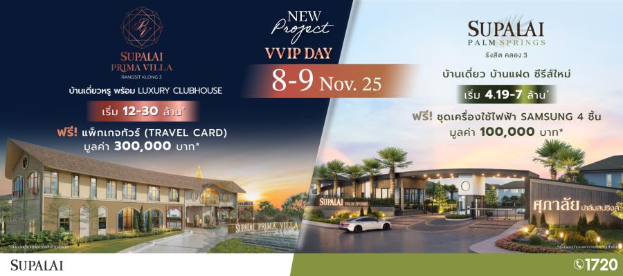 สัมผัสโอกาสพิเศษแห่งการใช้ชีวิตเหนือระดับก่อนใคร กับ 2 โครงการคุณภาพจากศุภาลัย พบกันในงาน “VVIP DAY” วันที่ 8–9 พฤศจิกายนนี้ พร้อมข้อเสนอสุดพิเศษเฉพาะภายในงาน เมื่อจองบ้านเดี่ยวหรูระดับพรีเมียม ศุภาลัย พรีมา วิลล่า รังสิต คลอง 3 ราคาเริ่มต้น 12-30 ล้านบาท* รับทันที ฟรี! แพ็กเกจท่องเที่ยว (Travel Card) มูลค่า 300000 บาท* หรือเลือกจองบ้านเดี่ยว–บ้านแฝดซีรีส์ใหม่ ศุภาลัย ปาล์มสปริงส์ รังสิต คลอง 3 ราคาเริ่มต้น 4-7 ล้านบาท* พร้อมรับ ฟรี! ชุดเครื่องใช้ไฟฟ้า SAMSUNG 4 ชิ้น มูลค่า 100000 บาท* สามารถเยี่ยมชมบ้านตัวอย่างได้แล้ววันนี้ (เงื่อนไขเป็นไปตามที่บริษัทฯ กำหนด)