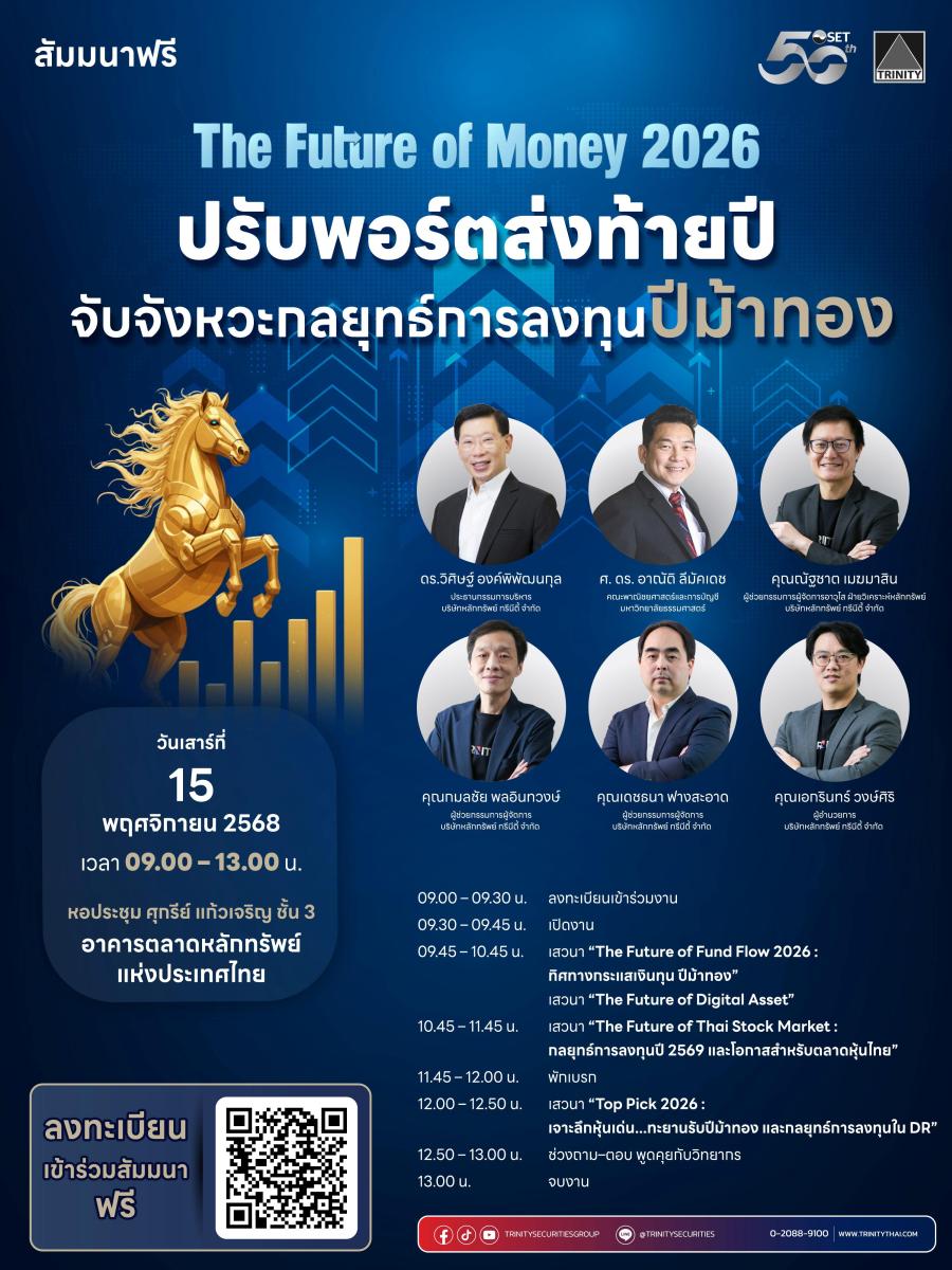บริษัทหลักทรัพย์ ทรีนีตี้ จำกัด ร่วมกับ ตลาดหลักทรัพย์แห่งประเทศไทย (SET) จัดงานสัมมนาใหญ่ส่งท้ายปี เพื่อให้นักลงทุนเตรียมความพร้อมและปรับกลยุทธ์พอร์ตการลงทุนรับ "ปีม้าทอง" ในหัวข้อ "The Future of Money 2026: ปรับพอร์ตส่งท้ายปี จับจังหวะกลยุทธ์การลงทุนปีม้าทอง"