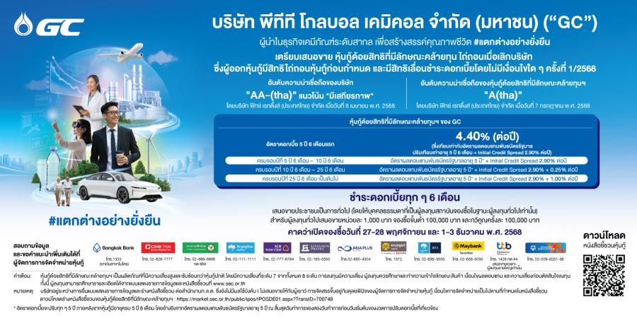 บริษัท พีทีที โกลบอล เคมิคอล จำกัด (มหาชน) หรือ GC ผู้นำในธุรกิจเคมีภัณฑ์ระดับสากล และแกนนำธุรกิจเคมีภัณฑ์ของกลุ่ม ปตท. ประกาศดอกเบี้ยหุ้นกู้ด้อยสิทธิที่มีลักษณะคล้ายทุน ไถ่ถอนเมื่อเลิกบริษัท ซึ่งผู้ออกหุ้นกู้มีสิทธิไถ่ถอนหุ้นกู้ก่อนกำหนด (“หุ้นกู้ด้อยสิทธิที่มีลักษณะคล้ายทุนฯ”) สำหรับ 5 ปี 6 เดือนแรกที่ 4.40% ต่อปี คาดเสนอขายต่อผู้ลงทุนทั่วไป (Public offering) ระหว่างวันที่ 27 – 28 พฤศจิกายน และ 1 – 3 ธันวาคม 2568 ผ่าน 12 สถาบันการเงิน