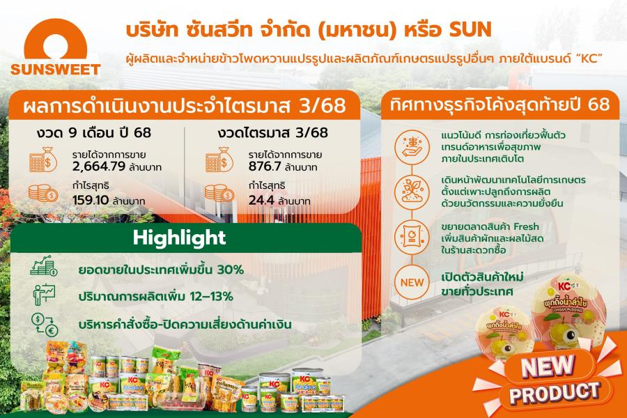 SUN เดินหน้าธุรกิจช่วงโค้งท้ายปี 2568 ปริมาณคำสั่งซื้อทั้งในประเทศและต่างประเทศกว่า 2000 ตู้ รับดีมานด์การท่องเที่ยวฟื้นตัวและเทรนด์ผู้บริโภคอาหารเพื่อสุขภาพโต พร้อมบริหารความเสี่ยงด้านค่าเงินผันผวนจากเศรษฐกิจโลก พัฒนาเทคโนโลยีการผลิต เตรียมเปิดตัวผลิตภัณฑ์ใหม่ “พุดดิ้งน้ำลำไย” ภายใต้แบรนด์ “KC” ขยายโอกาสทางการตลาดทั่วประเทศ ด้านผลประกอบการงวด 9 เดือนปี 2568 รายได้จากการขาย 2664.79 ล้านบาท กำไรสุทธิ 159.10 ล้านบาท