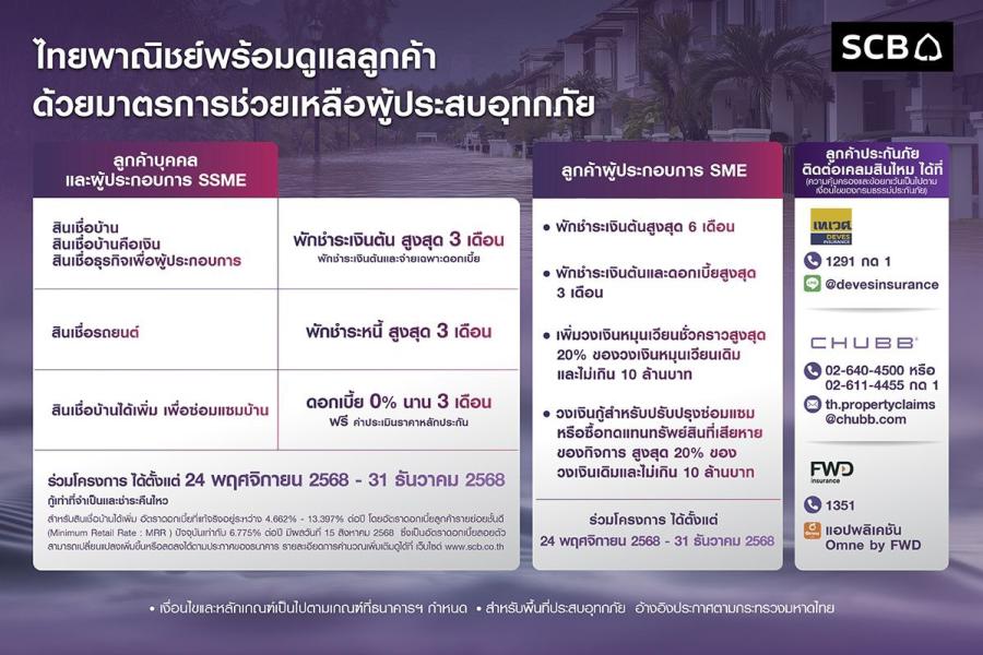 จากสถานการณ์อุทกภัยที่เกิดขึ้น ได้สร้างความเสียหายต่อทรัพย์สินและความเป็นอยู่ของประชาชนเป็นวงกว้าง โดยเฉพาะเหตุการณ์ล่าสุดในภาคใต้ ซึ่งได้รับผลกระทบครอบคลุมพื้นที่ 10 จังหวัด ได้แก่ สุราษฎร์ธานี กระบี่ นครศรีธรรมราช ตรัง พัทลุง สตูล สงขลา ปัตตานี ยะลา และนราธิวาส รวมทั้งพื้นที่ประสบอุทกภัยจังหวัดอื่นๆ ตามประกาศของกระทรวงมหาดไทย ธนาคารไทยพาณิชย์ตระหนักถึงความเดือดร้อนดังกล่าว และพร้อมอยู่เคียงข้างลูกค้าในการบรรเทาผลกระทบที่เกิดขึ้น โดยออกมาตรการเร่งด่วนเพื่อช่วยเหลือ ทั้งลูกค้าบุคคล ลูกค้าสินเชื่อธุรกิจเพื่อผู้ประกอบการ และลูกค้าผู้ประกอบการ SME ครอบคลุมทั้งลูกค้าปัจจุบันและลูกค้าใหม่ ทั้งในรูปแบบการพักชำระหนี้ และการสนับสนุนสินเชื่อใหม่เพื่อซ่อมแซมที่อยู่อาศัย รวมถึงฟื้นฟูกิจการที่ได้รับผลกระทบ โดยมีรายละเอียดดังนี้