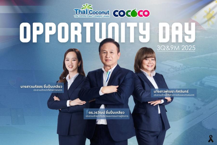 บริษัท ไทย โคโคนัท จำกัด (มหาชน) หรือ COCOCO นำโดย ดร.วรวัฒน์ ชิ้นปิ่นเกลียว ประธานเจ้าหน้าที่บริหารและกรรมการผู้จัดการ นางสาวพัฒรา ทัศจันทร์ ประธานเจ้าหน้าที่ฝ่ายการเงินและสารสนเทศ และ นางสาวนภัสสร ชิ้นปิ่นเกลียว ประธานเจ้าหน้าที่ฝ่ายการตลาด เข้าร่วมงานบริษัทจดทะเบียนพบผู้ลงทุน (Opportunity Day) ไตรมาส 3/2568 ซึ่งถ่ายทอดสดผ่านแพลตฟอร์มออนไลน์ของตลาดหลักทรัพย์แห่งประเทศไทย (SET) เพื่อรายงานภาพรวมผลการดำเนินงานและแนวโน้มธุรกิจของบริษัท และกลยุทธ์เติบโตในระยะต่อไป หลังบริษัทเดินหน้าขยายศักยภาพการผลิต และเพิ่มความแข็งแกร่งให้กับตลาดต่างประเทศอย่างต่อเนื่อง