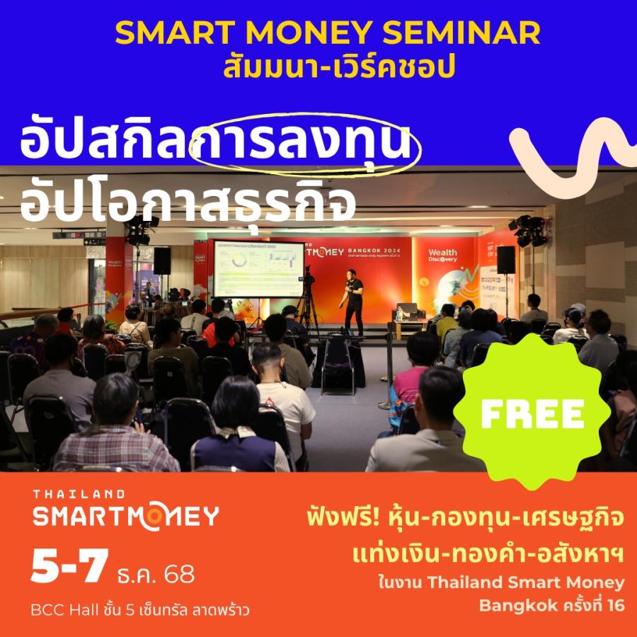 Thailand Smart Money Bangkok ครั้งที่ 16 เตรียมจัดงานภายใต้แนวคิด "Sustainable Investing" การลงทุนเพื่อการเปลี่ยนแปลง ขนสถาบันการเงิน มอบข้อเสนอพิเศษ ครบทุกโอกาสสร้างผลตอบแทน พร้อมปรึกษาวางแผนภาษีสุดคุ้ม พบกับตัวจริงการเงิน-ลงทุน อัดแน่นความรู้และความคุ้มค่าด้านการลงทุนตลอด 3 วัน ลงทะเบียนรับของที่ระลึกฟรี ลุ้นรับรางวัลใหญ่ภายในงาน ระหว่าง 5 - 7 ธ.ค. 68 ณ BCC Hall ชั้น 5 เซ็นทรัล ลาดพร้าว