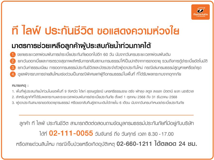 บริษัท ที ไลฟ์ ประกันชีวิต จำกัด (มหาชน) ขอแสดงความห่วงใยต่อผู้ประสบอุทกภัยในพื้นที่ภาคใต้ และตระหนักถึงผลกระทบที่ลูกค้าผู้เอาประกันภัยได้รับจากสถานการณ์น้ำท่วมครั้งนี้ เพื่อบรรเทาความเดือดร้อนและช่วยลดภาระ จึงได้ออกมาตรการช่วยเหลือเป็นการเร่งด่วน โดยขยายระยะเวลาผ่อนผันการชำระเบี้ยประกันภัยออกไปอีก 60 วัน นับจากวันครบกำหนดผ่อนผันเดิม พร้อมทั้งยกเว้นดอกเบี้ยและการตรวจสุขภาพสำหรับการกลับสถานะกรมธรรม์ที่ขาดอายุ รวมถึงกรณีที่มีการกู้ชำระเบี้ยอัตโนมัติ เพื่อให้ผู้เอาประกันสามารถรักษาความคุ้มครองได้อย่างต่อเนื่อง