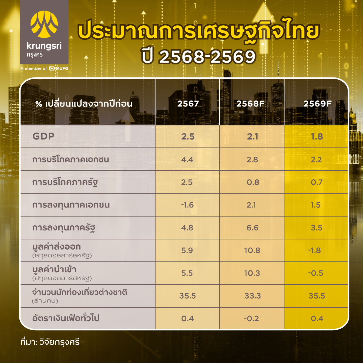 สำหรับอัตราเงินเฟ้อทั่วไปมีแนวโน้มอยู่ในระดับต่ำต่อเนื่อง โดยคาดว่าจะเพิ่มขึ้นเพียงเล็กน้อยเป็น 0.4% ในปี 2569 จากที่คาดว่าจะติดลบที่ -0.2% ในปี 2568 โดยอัตราเงินเฟ้อมีแนวโน้มจะเริ่มกลับเข้าสู่แดนบวกได้ในไตรมาสที่ 2 ของปี 2569 แต่ยังคงต่ำกว่ากรอบเป้าหมายของธนาคารแห่งประเทศไทย เนื่องจากคาดว่าราคาน้ำมันดิบดูไบในตลาดโลกจะทรงตัว ขณะเดียวกันรัฐบาลมีแนวโน้มจะคงมาตรการบรรเทาค่าครองชีพด้านพลังงานต่อเนื่อง ซึ่งช่วยจำกัดแรงกดดันด้านราคาโดยตรง ทั้งนี้ ภายใต้ภาวะเงินเฟ้อที่อยู่ในระดับต่ำ เศรษฐกิจที่ฟื้นตัวช้า และสภาพคล่องที่ตึงตัวจากการหดตัวของสินเชื่อ วิจัยกรุงศรีประเมินว่าคณะกรรมการนโยบายการเงิน (กนง.) จะมีการผ่อนคลายนโยบายการเงินเพิ่มเติม โดยคาดว่าอัตราดอกเบี้ยนโยบายอาจปรับลดลงสู่ระดับ 1.00% ในช่วงครึ่งแรกของปี 2569 เพื่อช่วยเพิ่มสภาพคล่อง ลดต้นทุนทางการเงิน และสนับสนุนการฟื้นตัวของเศรษฐกิจ