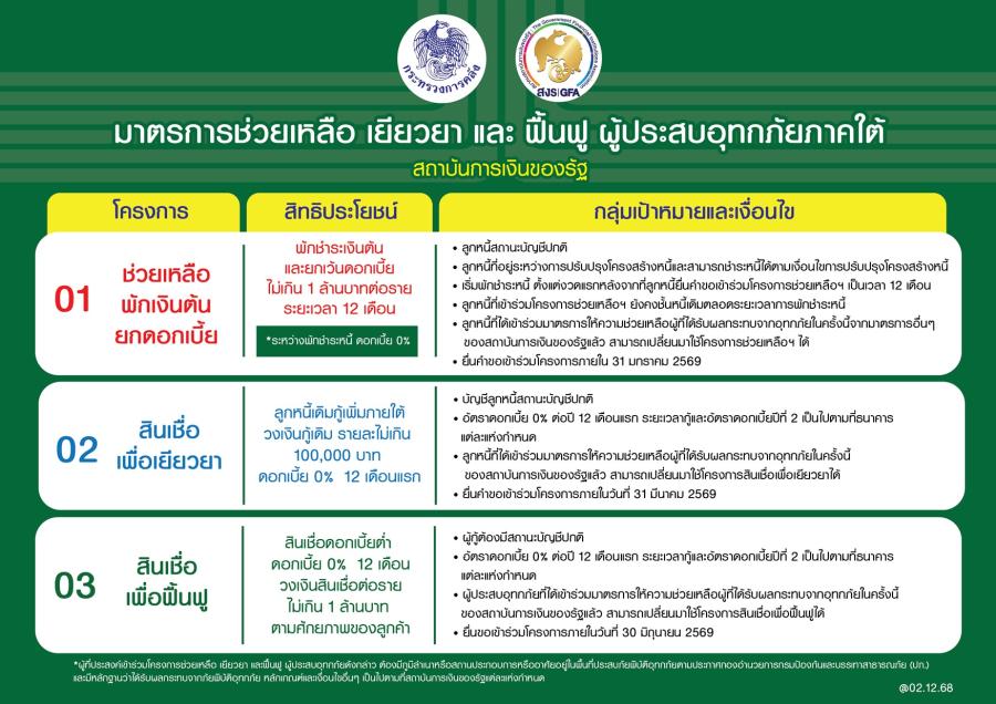 1. โครงการช่วยเหลือ : พักเงินต้น ยกดอกเบี้ยให้แก่ผู้ประสบอุทกภัยภาคใต้ เพื่อบรรเทาความเดือดร้อน ช่วยให้กลับมาดำเนินชีวิตได้ตามปกติโดยเร็ว โดยพักชำระเงินต้นและยกเว้นดอกเบี้ย รายละไม่เกิน1 ล้านบาท เป็นเวลา 12 เดือน โดยระหว่างพักชำระหนี้ ดอกเบี้ย 0% สำหรับบัญชีลูกหนี้สถานะบัญชีปกติ และบัญชีลูกหนี้ที่อยู่ระหว่างปรับปรุงโครงสร้างหนี้และสามารถชำระหนี้ได้ตามเงื่อนไขการปรับปรุงโครงสร้างหนี้ โดยลูกหนี้ที่เข้าร่วมมาตรการพักชำระหนี้ ยังคงชั้นหนี้เดิมตลอดระยะเวลาการพักชำระหนี้ ทั้งนี้ ลูกหนี้ที่ได้เข้าร่วมมาตรการให้ความช่วยเหลือผู้ที่ได้รับผลกระทบจากอุทกภัยในครั้งนี้จากมาตรการอื่นๆ ของสถาบันการเงินของรัฐแล้ว สามารถเปลี่ยนมาใช้โครงการช่วยเหลือฯ ได้ โดยสามารถยื่นคำขอเข้าร่วมโครงการภายในวันที่ 31 มกราคม 2569