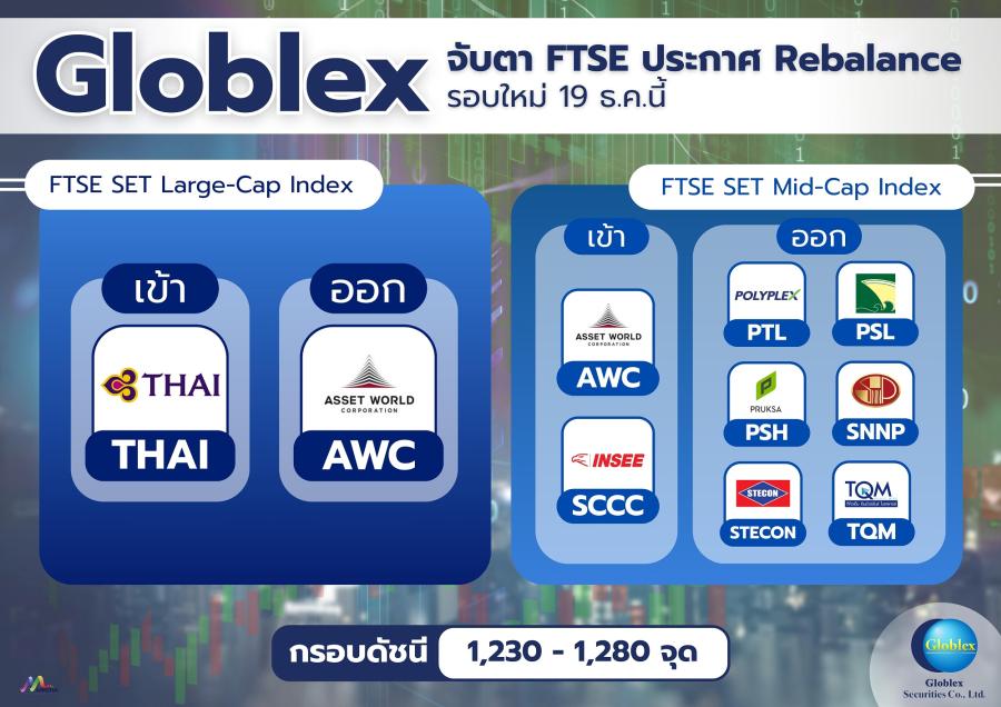 นายวัชเรนทร์ จงยรรยง ผู้อำนวยการฝ่ายวิจัย บล.โกลเบล็ก แนะนำกลยุทธ์การลงทุนในหุ้น ได้ประโยชน์จากการปรับลดน้ำหนักการลงทุนจากดัชนี FTSE Rebalancing ซึ่งจะมีผลบังคับวันที่ 19 ธันวาคม 2568 โดยหุ้นที่ FTSE SET Large-Cap Index นำเข้าคำนวณ ได้แก่ THAI และนำออกจากการคำนวณ ได้แก่ AWC ด้าน FTSE SET Mid-Cap Index ที่มีการนำเข้าคำนวณ ได้แก่ AWC SCCC และนำออกจากการคำนวณ ได้แก่ PTL PSL PSH SNNP STECON และ TQM