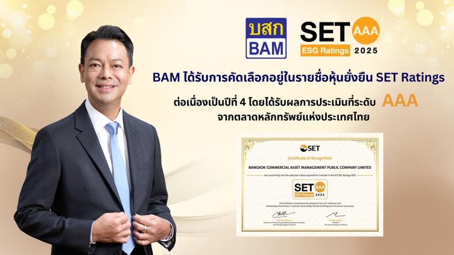 ดร.รักษ์ วรกิจโภคาทร ประธานเจ้าหน้าที่บริหาร BAM เปิดเผยว่า BAM ได้รับผลประเมินหุ้นยั่งยืน SET ESG Ratings ระดับ “AAA” ในกลุ่มธุรกิจการเงิน (Financials) จากการประกาศผลประเมินหุ้นยั่งยืน SET ESG Ratings ประจำปี 2568 ของตลาดหลักทรัพย์แห่งประเทศไทย สะท้อนให้เห็นถึงความมุ่งมั่นในการดำเนินงานของบริษัทฯ ที่ให้ความสำคัญต่อการดำเนินธุรกิจอย่างยั่งยืน ยกระดับการดำเนินงานภายใต้กรอบ ESG ครอบคลุมในทุกมิติ ทั้งด้านสิ่งแวดล้อม สังคม เศรษฐกิจและการกำกับดูแลกิจการ โดยคำนึงถึงผู้มีส่วนได้เสียทุกภาคส่วน ตอบสนองวิสัยทัศน์ “เป็นองค์กรหลักในการพลิกฟื้นสินทรัพย์เพื่อช่วยขับเคลื่อนเศรษฐกิจและสังคมไทยให้เติบโตอย่างยั่งยืน” และแสดงให้เห็นถึงศักยภาพการเติบโตขององค์กรในระยะยาว