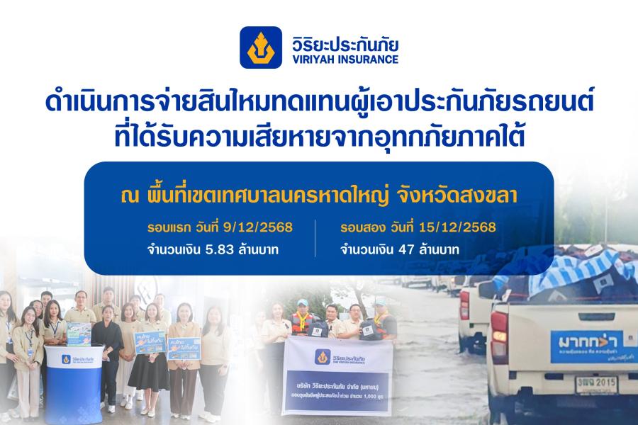 “บริษัทฯ ได้เร่งดำเนินการจ่ายสินไหมทดแทนให้แก่ลูกค้าที่ได้รับผลกระทบอย่างต่อเนื่อง ทั้งนี้ ตามรายงานของศูนย์ปฏิบัติการสินไหมทดแทนวิริยะประกันภัยในพื้นที่ภาคใต้ ณ ปัจจุบัน มีรถยนต์ที่ได้รับความเสียหายจากน้ำท่วมประมาณ 4300 คัน โดยพื้นที่ที่ได้รับผลกระทบมากที่สุด คือ เขตเทศบาลนครหาดใหญ่ จำนวน 3800 คัน บริษัทฯ จึงได้ระดมเจ้าหน้าที่ดำเนินงานเร่งรัดตรวจสอบและพิจารณาเอกสารประกอบการเคลมทุกวัน ตลอด 24 ชั่วโมง โดยเบื้องต้นบริษัทฯ ได้ดำเนินการจ่ายสินไหมทดแทนให้แก่ผู้เอาประกันภัย รอบแรก ณ วันที่ 9 ธันวาคม 2568 เป็นการคืนทุนประกันภัยเต็มจำนวนตามที่ระบุไว้ในกรมธรรม์ ซึ่งเป็นรถสันดาปทั้งหมด เป็นเงินจำนวน 5.83 ล้านบาท รอบถัดไปในวันที่ 15 ธันวาคม 2568 สำหรับเคสที่มีเอกสารประกอบการเรียกร้องค่าสินไหมทดแทนครบถ้วน เป็นเงินจำนวน 47 ล้านบาท และจนถึงสิ้นปี 2568 คาดว่าจะจ่ายสินไหมฯ แล้วเสร็จ โดยบริษัทฯ ขอยืนยันความมุ่งมั่นในการดูแลผู้เอาประกันภัยทุกท่านให้ได้รับการชดเชยอย่างครบถ้วน รวดเร็ว และเป็นธรรมสูงสุด” คุณณัฐพงศ์กล่าว
