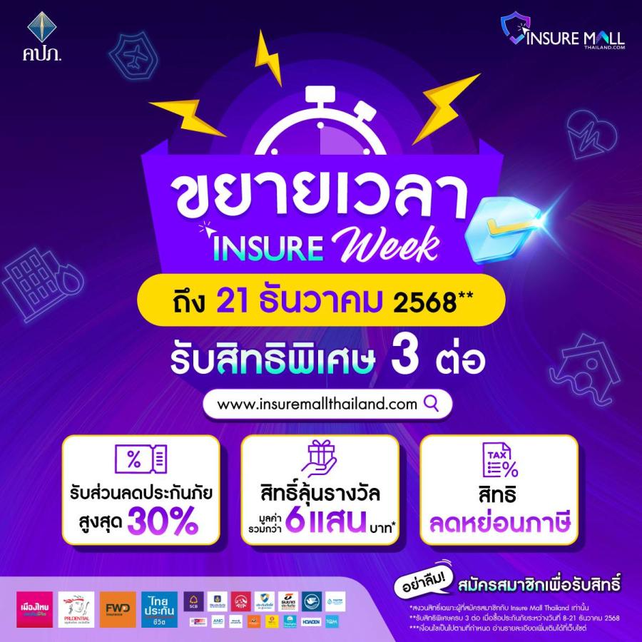 ต่อที่ 2: ลุ้นรางวัลใหญ่รวมมูลค่ากว่า 600000 บาท มากกว่า 430 รางวัล สำหรับผู้ซื้อประกันภัยในช่วง Insure Week (8-21 ธันวาคม 2568) สิทธิ์ลุ้นรางวัลสงวนเฉพาะสมาชิก Insure Mall สมัครได้ที่ www.insuremallthailand.com