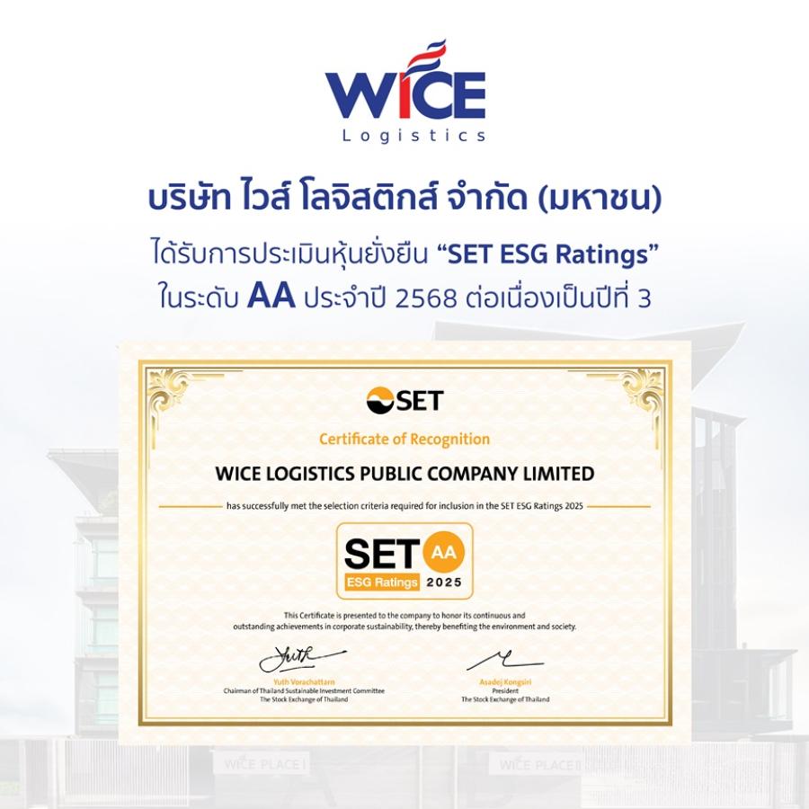 นายชูเดช คงสุนทร กรรมการผู้จัดการ ส่วนงานพัฒนาธุรกิจกลุ่มบริษัท บริษัท ไวส์ โลจิสติกส์ จำกัด (มหาชน) หรือ WICE ผู้ให้บริการโลจิสติกส์ระหว่างประเทศแบบครบวงจร เปิดเผยว่า บริษัทได้รับการประเมิน SET ESG Ratings ประจำปี 2568 ระดับ AA ในกลุ่มบริการ ต่อเนื่องเป็นปีที่ 3 ด้วยคะแนนการประเมิน 86 คะแนน โดยเป็น 1 ใน 265 บริษัทจดทะเบียนที่ได้รับการประกาศผลประเมินหุ้นยั่งยืน SET ESG Ratings จากตลาดหลักทรัพย์แห่งประเทศไทย (ตลท.) สะท้อนให้เห็นความมุ่งมั่นในการดำเนินธุรกิจควบคู่กับการคำนึงถึงสิ่งแวดล้อม สังคม และ การบริหารงานตามหลักบรรษัทภิบาล (Environmental Social and Governance หรือ ESG)