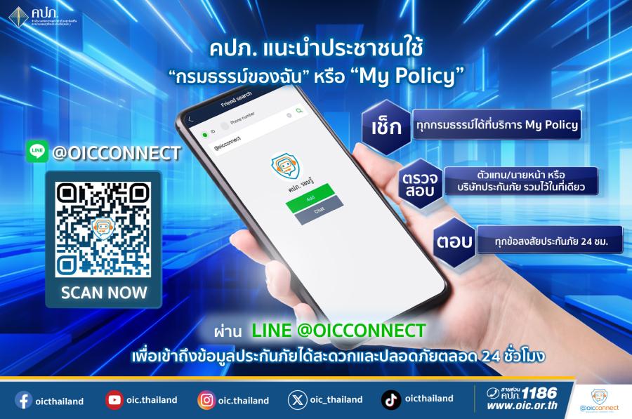 คปภ. แนะนำประชาชนใช้บริการ “กรมธรรม์ของฉัน” หรือ “My Policy” ผ่าน LINE @OICConnect