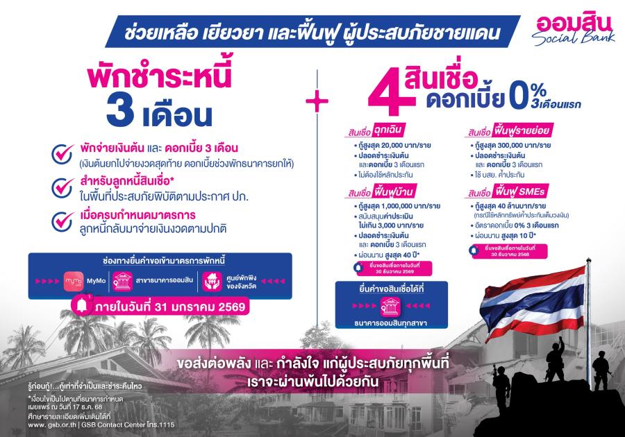 นางลภาวรรณ จันทร์กระจ่าง รองผู้อำนวยการธนาคารออมสิน รักษาการแทนผู้อำนวยการธนาคารออมสิน เปิดเผยว่า จากสถานการณ์ความไม่สงบในพื้นที่บริเวณชายแดน ซึ่งส่งผลกระทบต่อชีวิต ทรัพย์สินและการดำรงชีพของประชาชน ธนาคารออมสินจึงเร่งจัดชุดมาตรการช่วยเหลือรอบด้าน ทั้งพักชำระเงินต้นและไม่คิดดอกเบี้ย นาน 3 เดือน เพื่อบรรเทาภาระหนี้ของลูกค้าธนาคารออมสินในพื้นที่ประสบภัยพิบัติตามประกาศของกรมป้องกันและบรรเทาสาธารณภัย (ปภ.) ควบคู่กับมาตรการสินเชื่อเงื่อนไขพิเศษ เพื่อเสริมสภาพคล่อง ซ่อมแซม และฟื้นฟูการดำเนินชีวิต รวมถึงการให้ความช่วยเหลือตามหลักมนุษยธรรมในระยะเร่งด่วนให้กับประชาชนด่านหน้า และการจัดสรรงบประมาณเพื่อการเยียวยาเป็นกำลังใจให้ครอบครัวพลเรือนและทหารกล้าผู้เสียสละชีวิต