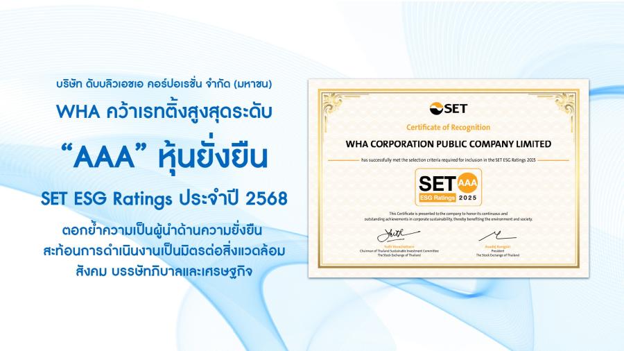 WHA คว้าเรทติ้งสูงสุดระดับ “AAA” SET ESG Ratings ประจำปี 2568