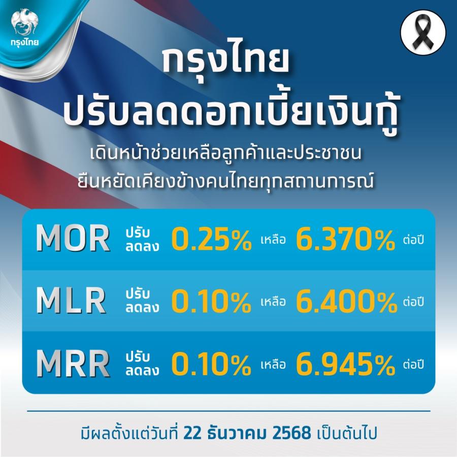 ธนาคารกรุงไทย ประกาศปรับลดอัตราดอกเบี้ยเงินกู้สูงสุด 0.25% ต่อปี เพื่อช่วยบรรเทาภาระทางการเงินให้แก่ประชาชนและภาคธุรกิจ ท่ามกลางสถานการณ์เศรษฐกิจไทยที่มีแนวโน้มชะลอตัวอย่างชัดเจน โดยมีผลตั้งแต่วันที่ 22 ธันวาคม 2568 เป็นต้นไป สะท้อนบทบาทของธนาคารที่ยืนหยัดเคียงข้างลูกค้าในทุกช่วงเวลา