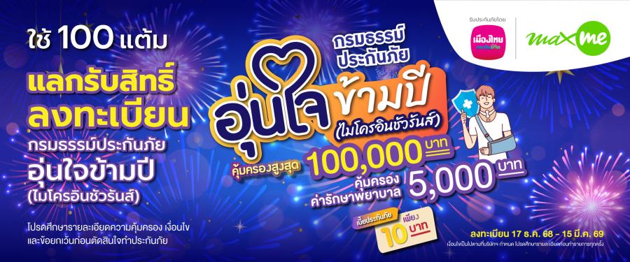 เมืองไทยประกันชีวิต ผนึกกำลัง แมกซ์ โซลูชัน เซอร์วิส บริษัทในเครือพีทีจี เพิ่มความอุ่นใจต้อนรับเทศกาลปีใหม่แก่สมาชิก Max Card ทั่วประเทศ ผ่าน“กรมธรรม์ประกันภัยอุ่นใจข้ามปี (ไมโครอินชัวรันส์)” ประกันภัยอุบัติเหตุกลุ่มที่ให้ความคุ้มครองครอบคลุมทั้งด้านชีวิตและค่ารักษาพยาบาลเนื่องจากอุบัติเหตุ เพียงใช้แมกซ์พอยท์ 100 คะแนน แลกรับสิทธิ์ผ่านช่องทางแอปพลิเคชัน Max Me เริ่มตั้งแต่วันที่ 17 ธันวาคม 2568 – 15 มีนาคม 2569 (จำนวนสิทธิ์ 1000 สิทธิ์)