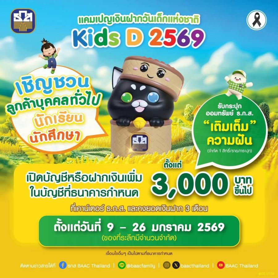 ธนาคารเพื่อการเกษตรและสหกรณ์การเกษตร (ธ.ก.ส.) เปิดตัวกระปุกออมทรัพย์ ธ.ก.ส. “เติมเต็ม ความฝัน” น้องแมวสุดน่ารัก เนื่องในโอกาสวันเด็กแห่งขาติ 2569 เพื่อสร้างเสริมนิสัยการออมเงินในเด็กและเยาวชน นักเรียน นักศึกษา ตลอดจนบุคคลทั่วไป ผ่านการฝากเงินในแคมเปญเงินฝากวันเด็กแห่งชาติ “Kids D 2569” เพียงเปิดบัญชีใหม่ หรือฝากเงินเพิ่มเข้าบัญชีเงินฝาก อาทิ เงินฝากออมทรัพย์ เงินฝากออมทรัพย์ทวีโชค เงินฝากออมทรัพย์พื้นฐาน เงินฝากออมทรัพย์ Senior Savings เงินฝากออมทรัพย์พิเศษ เงินฝากแก้วมรกต และเงินฝากรักษาทรัพย์ ผ่านเคาน์เตอร์ที่สาขาของธนาคารทั่วประเทศ จำนวน 3000 บาทขึ้นไป และคงยอดเงินฝากไว้ 3 เดือนนับจากวันที่ฝาก ได้ตั้งแต่วันที่ 9-26 มกราคม 2569 รับเลยกระปุกออมทรัพย์ ธ.ก.ส.“เติมเต็ม ความฝัน” จำกัดลูกค้า 1 รายต่อกระปุก 1 ชิ้น ฝากก่อนได้ก่อนของมีจำนวนจำกัด !
