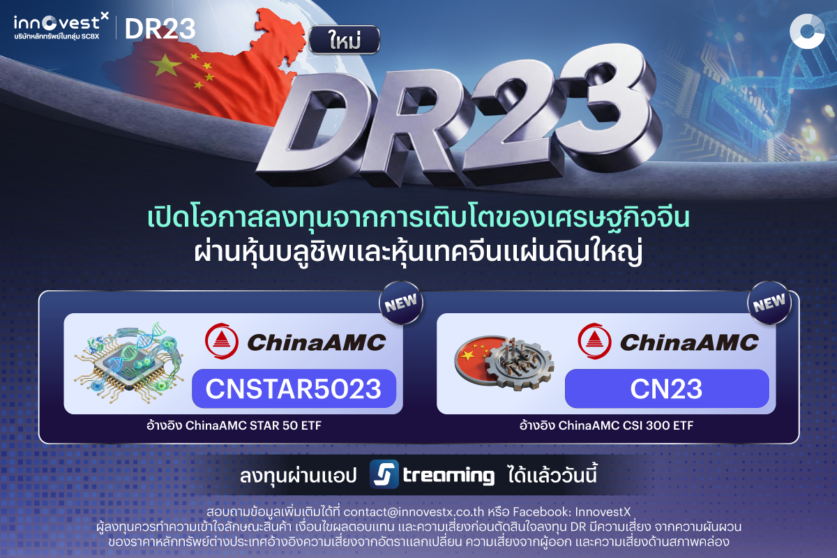 บริษัทหลักทรัพย์ อินโนเวสท์ เอกซ์ จำกัด (InnovestX) บริษัทหลักทรัพย์ในกลุ่มเอสซีบีเอกซ์ (SCBX Group) เดินหน้าต่อยอดกลยุทธ์การนำโอกาสจากตลาดทุนโลกมาให้นักลงทุนไทย ร่วมกับ China Asset Management (ChinaAMC) หนึ่งในบริษัทหลักทรัพย์จัดการกองทุนชั้นนำของจีน เปิดตัวตราสารแสดงสิทธิในหลักทรัพย์ต่างประเทศ (DR23) ใหม่ 2 หลักทรัพย์ ได้แก่ CN23 อ้างอิง ChinaAMC CSI 300 ETF เข้าถึงแกนหลักเศรษฐกิจจีน ผ่านหุ้นบลูชิพ A-Share ครอบคลุมภาคเศรษฐกิจสำคัญ ตั้งแต่การเงิน บริโภค เทคโนโลยี ไปจนถึงอุตสาหกรรม และ CNSTAR5023 อ้างอิง ChinaAMC STAR 50 ETF เข้าถึง 50 บริษัทเทคโนโลยีแกนหลักของจีน บน STAR Market (Science and Technology Innovation Board กระดานซื้อขายหุ้นด้านเทคโนโลยีและนวัตกรรมของจีน) ครอบคลุมชิปขั้นสูงไปจนถึงนวัตกรรมแห่งอนาคต ซึ่ง ETF ทั้ง 2 หลักทรัพย์จดทะเบียนในตลาดหุ้นจีนแผ่นดินใหญ่โดยตรง มีค่าธรรมเนียมบริหารจัดการต่ำเพียง 0.15% ต่อปี ช่วยเพิ่มประสิทธิภาพการลงทุนในระยะยาว โดยสามารถซื้อขายได้ด้วยเงินบาท ผ่านตลาดหุ้นไทยสะดวก และอยู่ภายใต้กรอบกำกับดูแลของตลาดทุนไทย